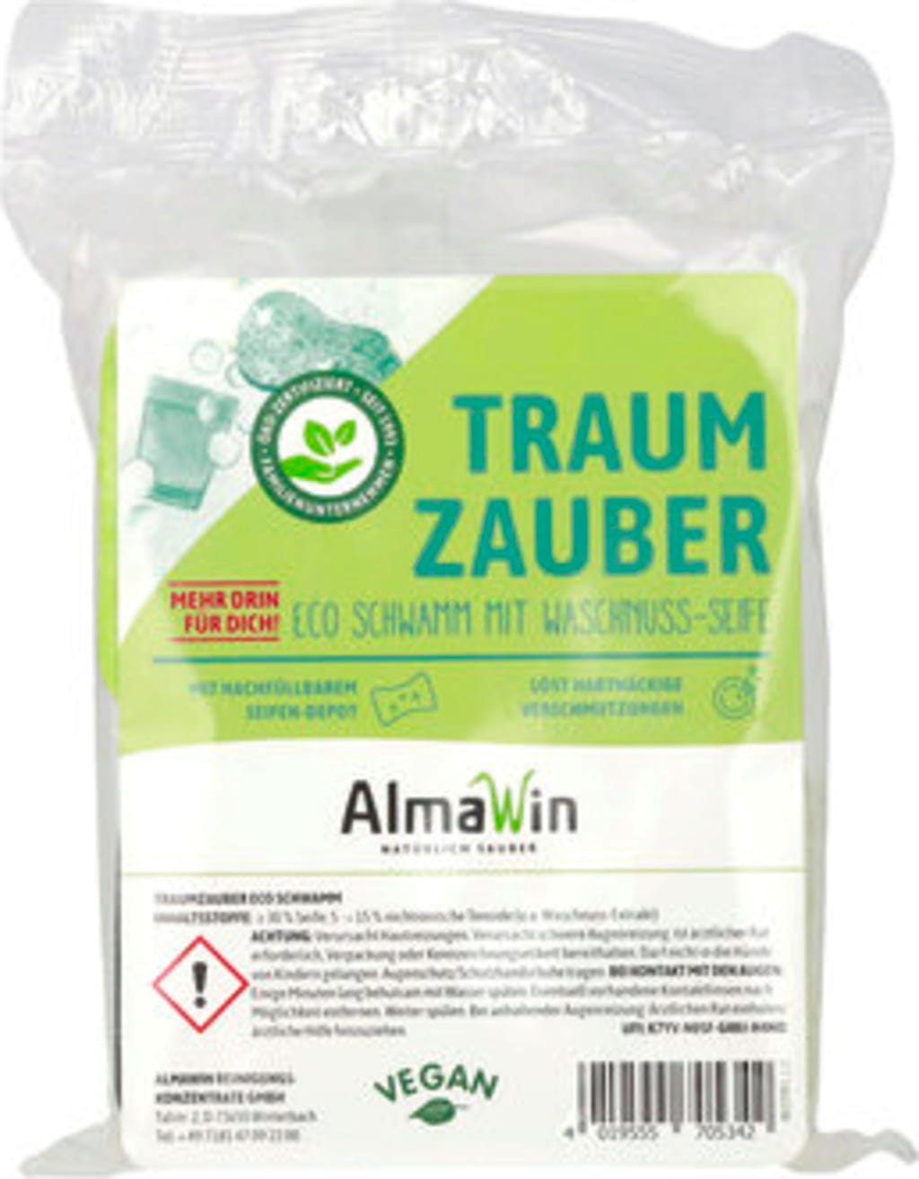La spugna ecologica di AlmaWin (fornita in una confezione da 2 pezzi) è composta da 3 strati. Un lato è ricoperto di lana di acciaio inossidabile di alta qualità, imbevuta di sapone di noce di sapone biologico certificato. Ciò consente di rimuovere facilmente lo sporco ostinato e le incrostazioni. Il morbido lato di viscosa, invece, è pensato per pulire le superfici delicate. Il fulcro è un nucleo di spugna assorbente che è in gran parte realizzato a base di olio di girasole.
