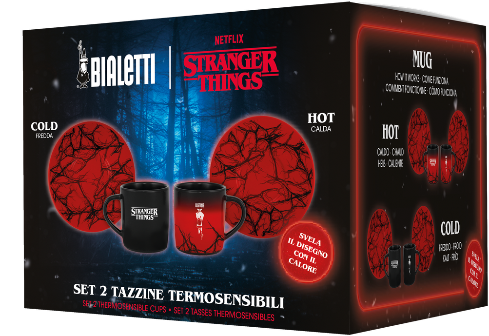 Il piacere dell'espresso con quel "qualcosa in più": non appena le tazze in ceramica termosensibile di alta qualità vengono riempite di caffè caldo, cambiano colore come per magia e compaiono elementi ispirati al mondo del Sottosopra.
