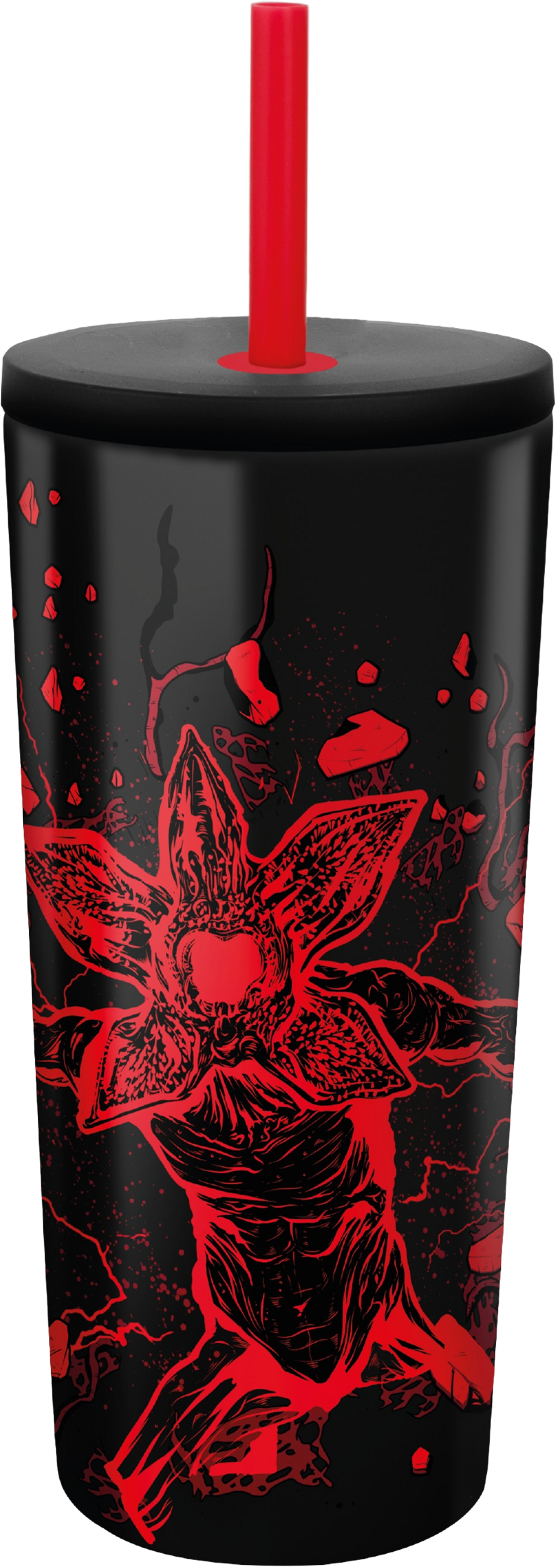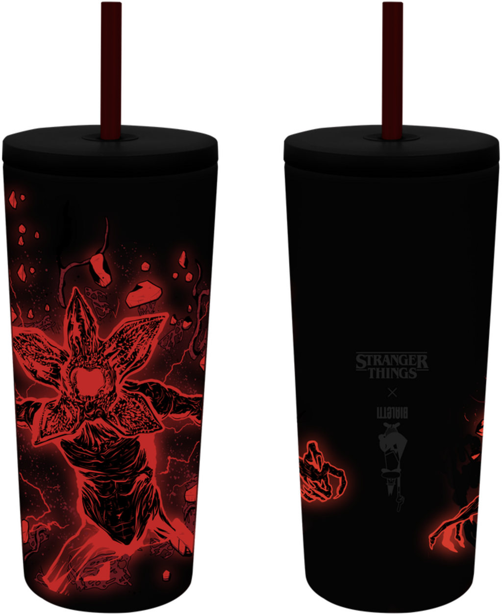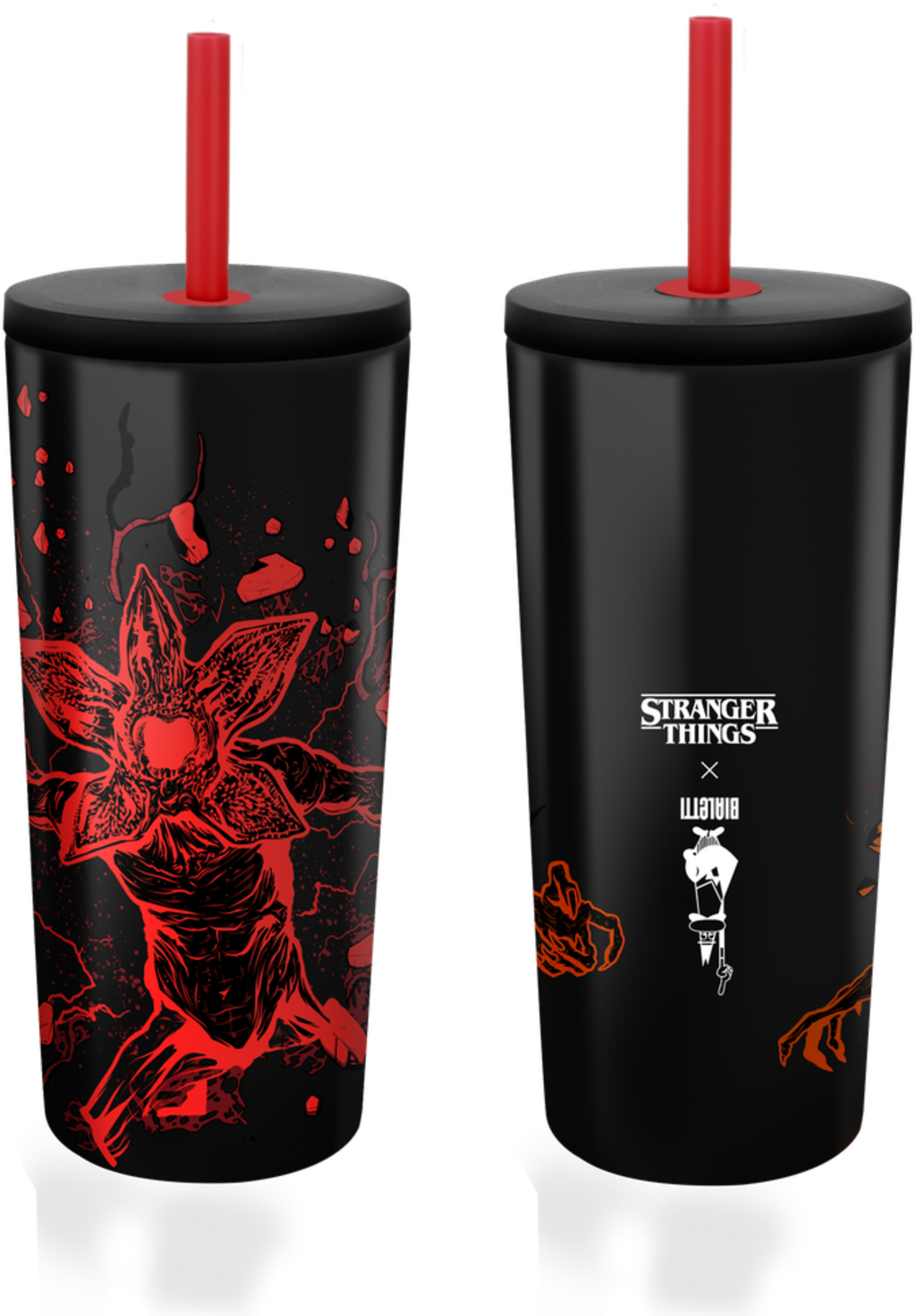 La grafica disegnata in esclusiva nel look di "Stranger Things" rende questo contenitore termico davvero unico. La cannuccia in silicone permette di bere la tua bevanda preferita con la massima comodità. La caratteristica speciale è che al buio il Demogorgone si illumina di rosso, così il Sottosopra non ti abbandona mani!
