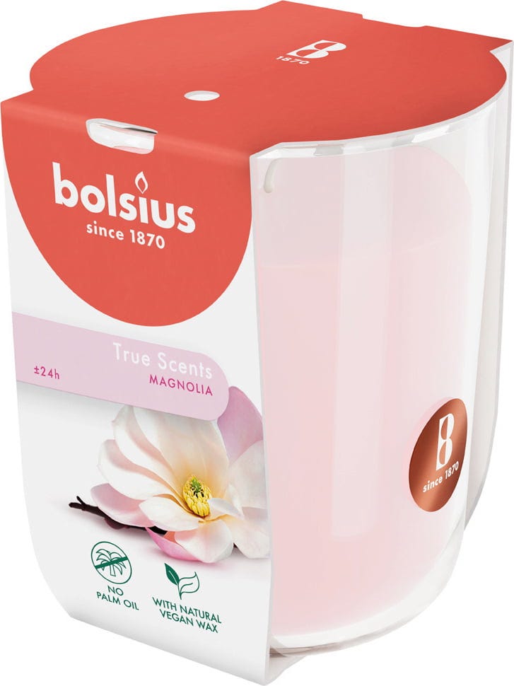 La candela in vetro True Scents di bolsius diffonde il suo profumo per fino a 25 ore e aiuta a neutralizzare gli odori di fumo grazie alla tecnologia Freshplex™. È composta in parte da cera vegetale e priva di olio di palma.