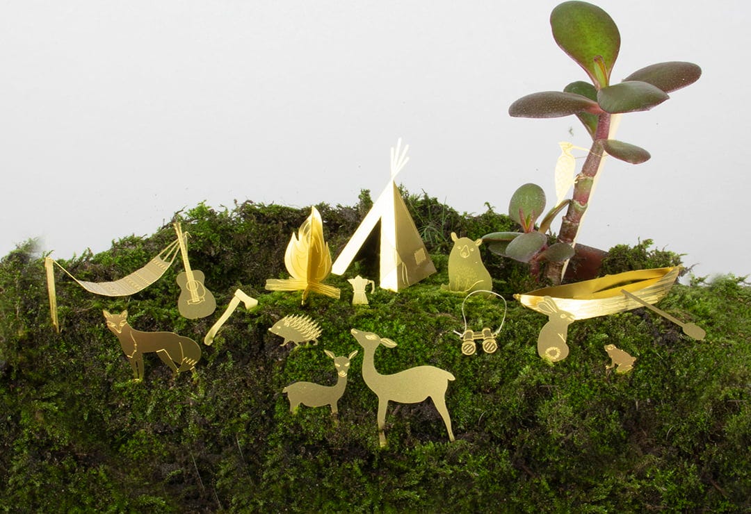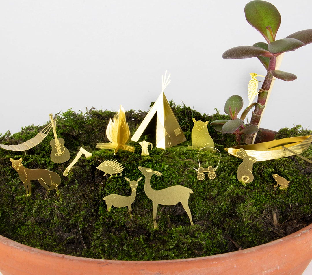 Questo meraviglioso set, ispirato alle avventure in campeggio, è pensato per decorare in modo creativo e originale i vasi di piante.