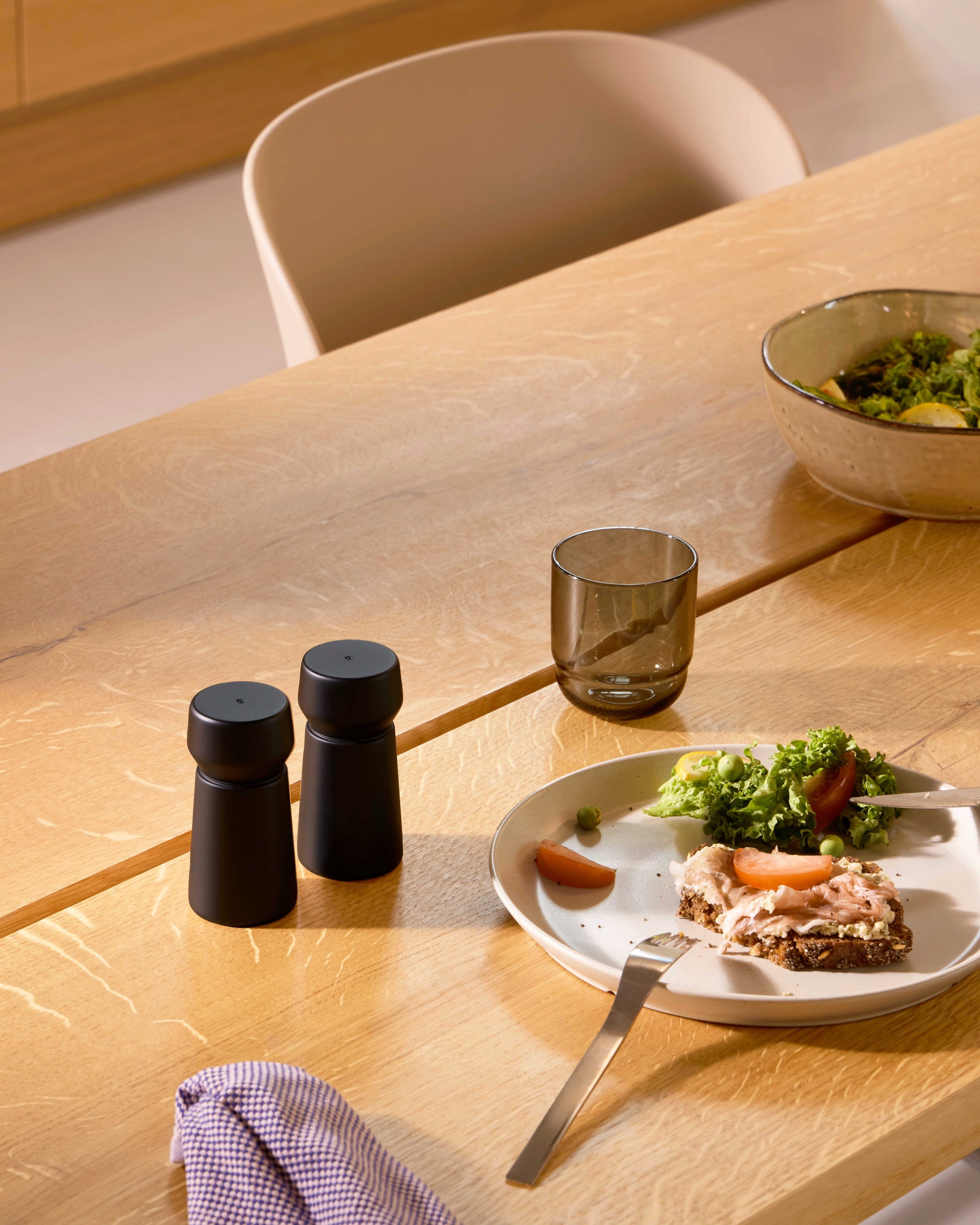 Il set Amsterdam porta linee pulite e un'estetica urbana direttamente sulla tua tavola. Realizzate in legno di faggio di alta qualità certificato FSC, queste due macinaspezie compatte non sono solo un piacere per gli occhi, ma anche particolarmente maneggevoli. Le discrete incisioni per sale e pepe ti permettono di distinguere facilmente il contenuto, mentre il robusto meccanismo in ceramica garantisce una macinatura precisa e duratura. Per riempirle basta rimuovere la parte superiore, senza bisogno di svitare. Un duo elegante che unisce design minimalista e funzionalità.