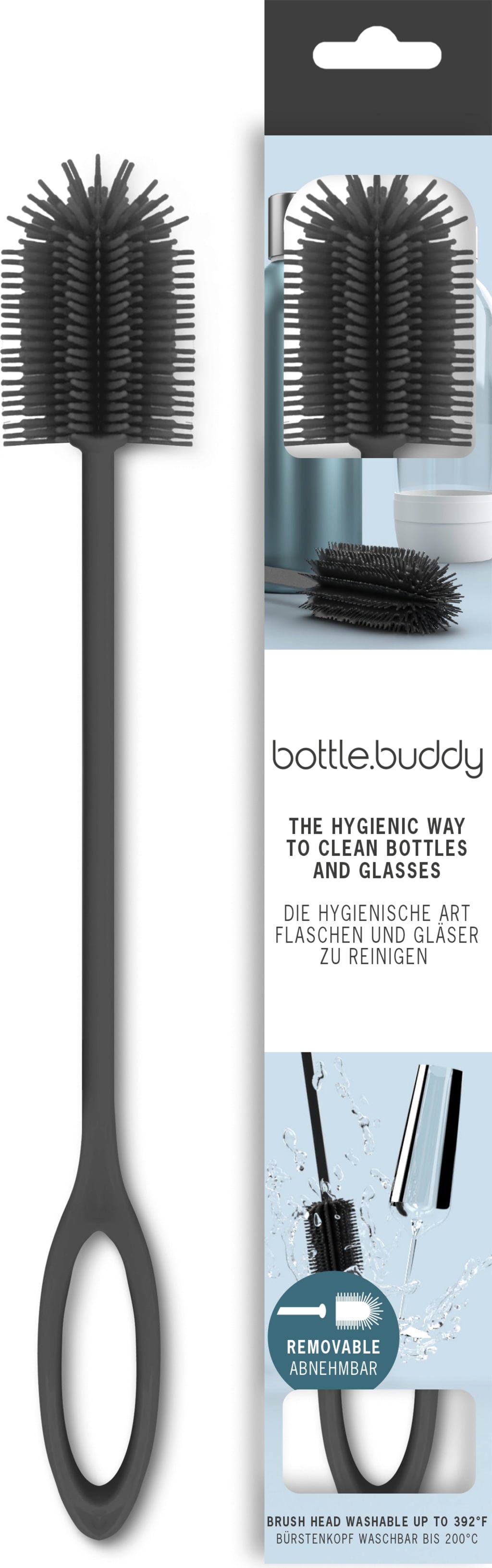Dimentica lo sporco ostinato e i punti difficili da raggiungere nelle tue borracce. Con bottle.buddy pulisci vetro, acciaio inox e borracce termiche in modo delicato ed efficace. Grazie alla lunghezza di 35 cm, raggiunge facilmente ogni angolo, mentre quasi 500 morbide setole in silicone alimentare rimuovono lo sporco senza graffiare.