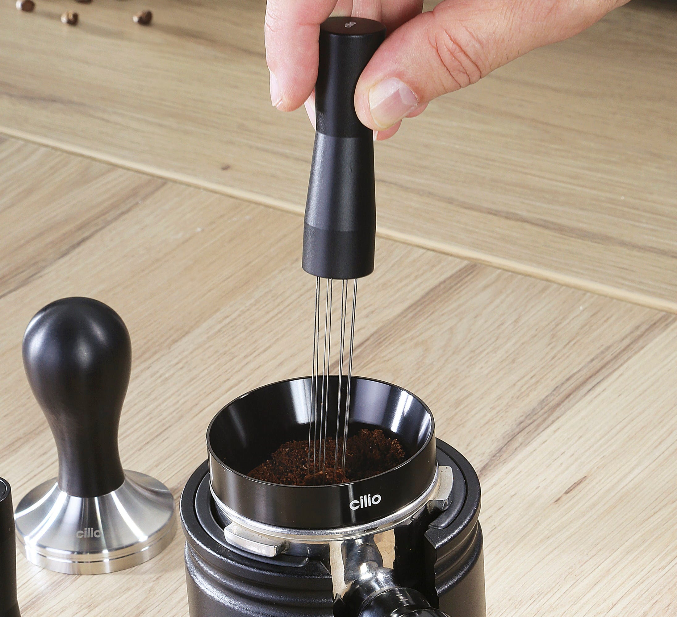 Dimentica il caffè macinato grumoso e il “channeling”. L'ago distributore per caffè BARISTA di cilio è uno strumento indispensabile per portare il tuo setup espresso a un livello superiore. Inserisci gli aghi nella polvere e mescola con movimenti circolari dal fondo verso la superficie: in questo modo eventuali grumi si sciolgono e il caffè si distribuisce in modo uniforme nel portafiltro.