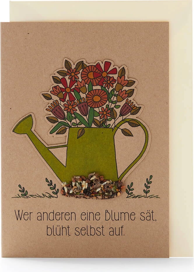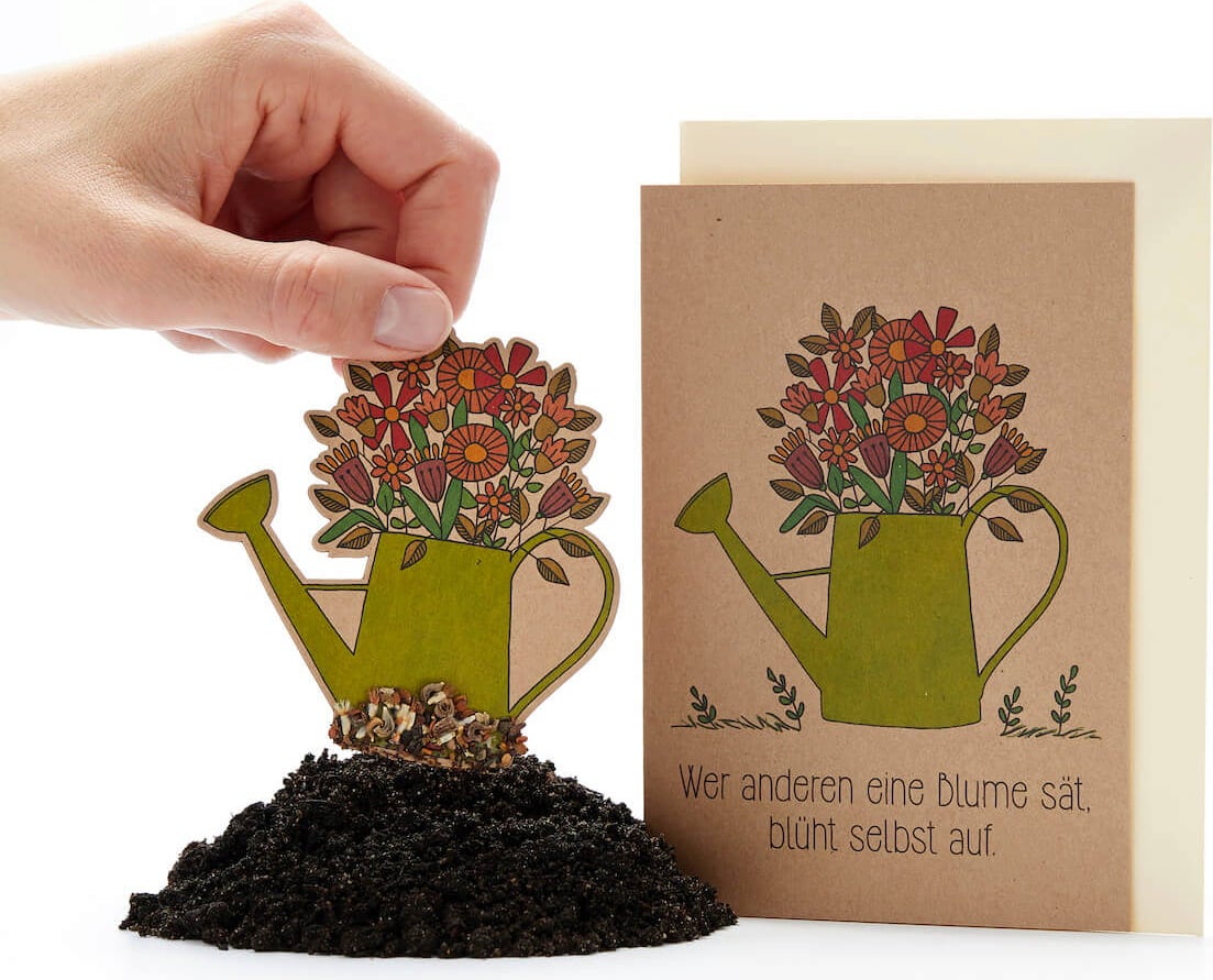 La particolarità? L'annaffiatoio del bigliettino è pieno di semi! Chi lo riceve infatti può staccarlo dalla carta e piantarlo. Dopo un po' di tempo e le giuste cure, cresceranno tanti bei fiori di campo.
