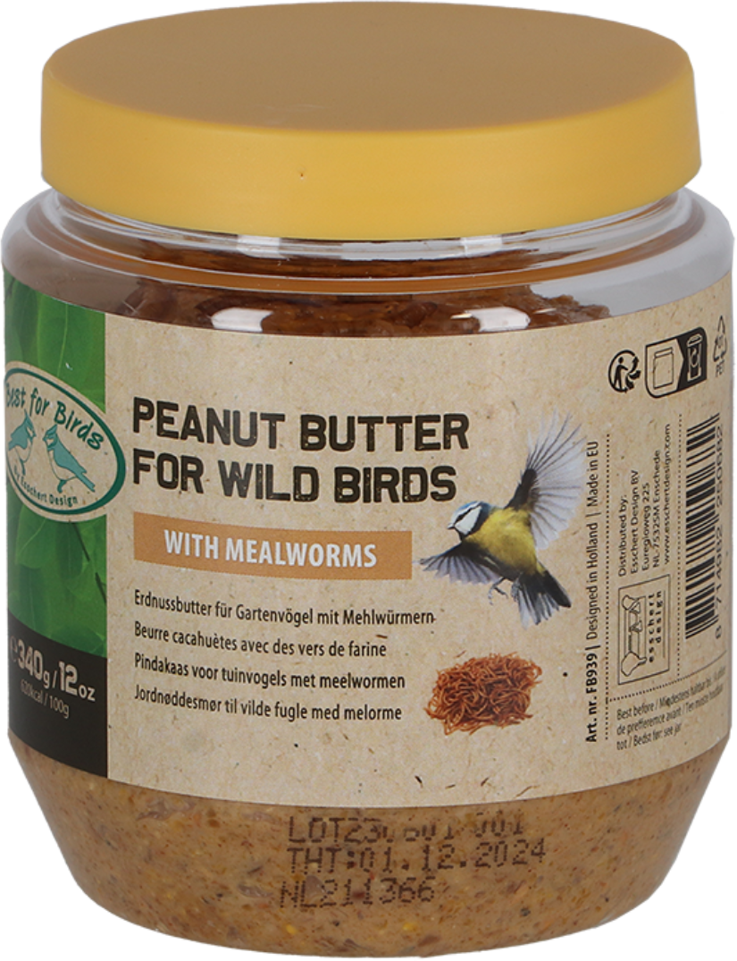 Questo burro di arachidi è arricchito con tarme della farina, per questo costituisce un pasto particolarmente gustoso e ricco di calorie per le numerose specie di uccelli presenti nel giardino. Poiché il sale non è adatto agli uccelli, questo burro di arachidi non contiene sale aggiunto. Le tarme della farina che contiene sono estremamente nutrienti e forniscono agli uccelli anche molte proteine preziose.