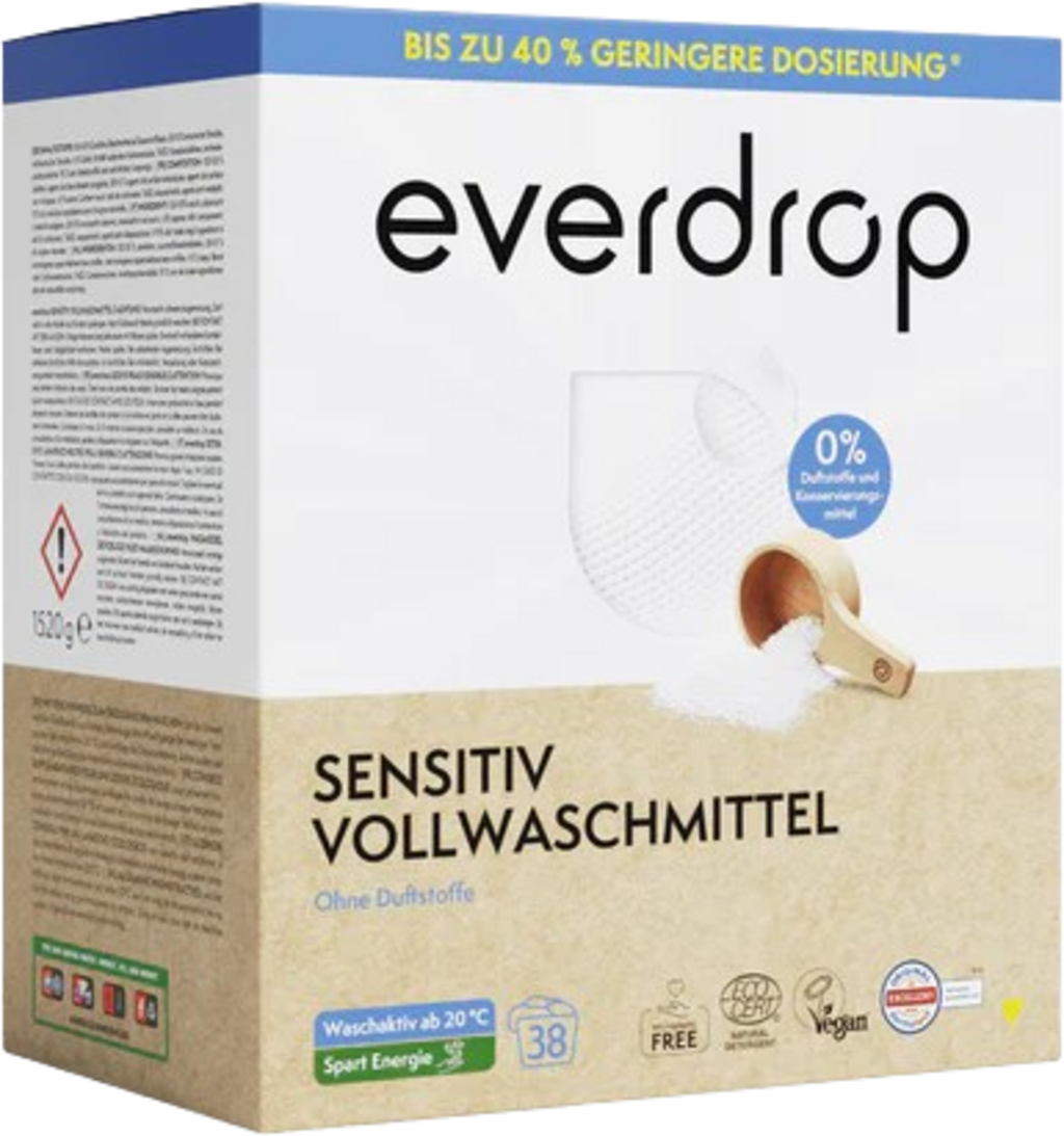 Il detersivo in polvere Sensitive è privo di enzimi, profumi, coloranti e conservanti, ed è quindi ideale per chi ha la pelle sensibile. È efficace già a partire da 20 °C e, grazie alla sua formula concentrata, pulisce in profondità rispettando le fibre e i colori dei tessuti. L’uso a basse temperature permette inoltre di risparmiare energia e ridurre l’impatto ambientale.