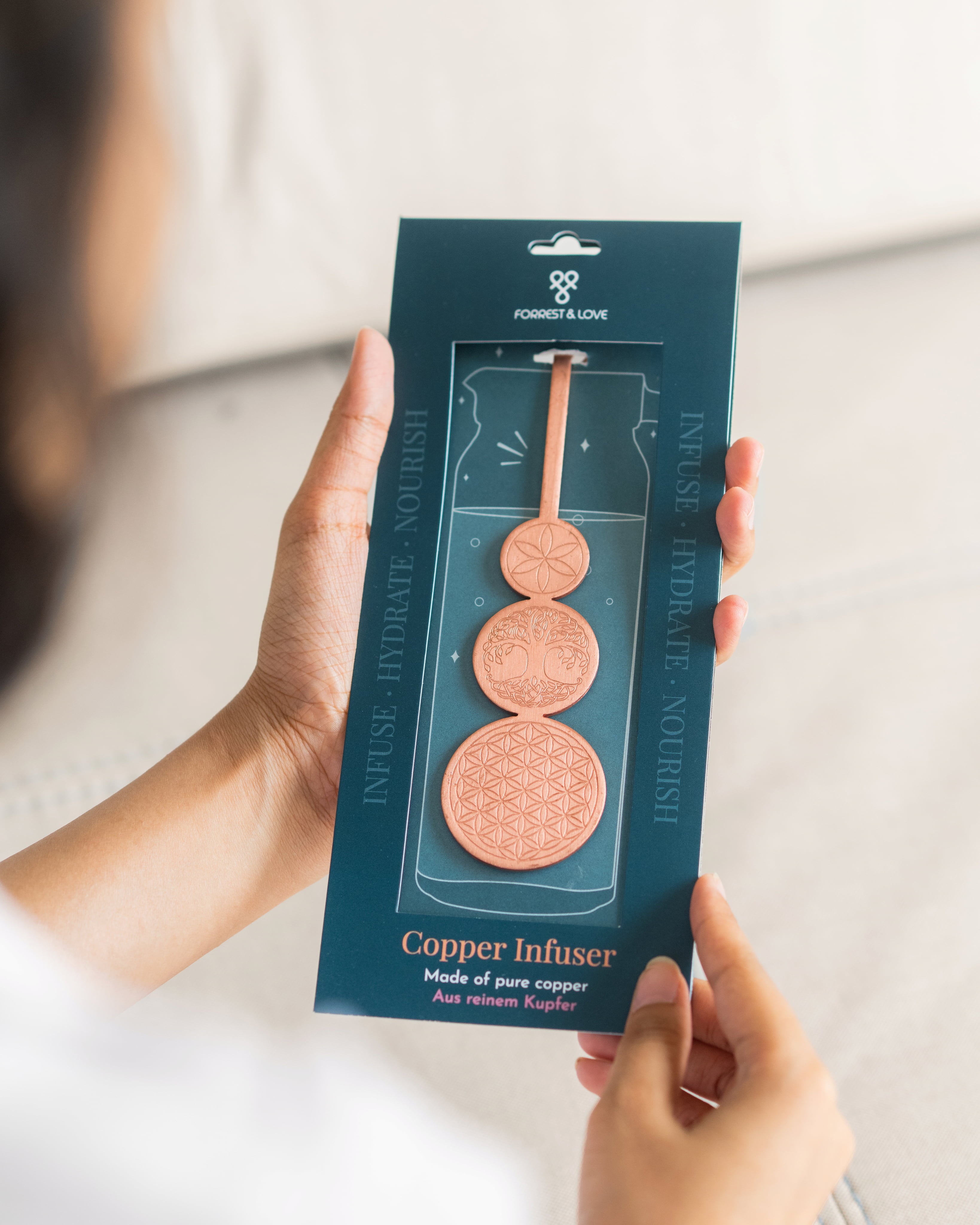 Questo accessorio di FORREST & LOVE, accuratamente realizzato a mano, può essere utilizzato su quasi tutti i contenitori d'acqua per poter godere delle proprietà antimicrobiche, antiossidanti e antinfiammatorie del rame. Il design dell'accessorio è elegante, dura per sempre ed è un validissimo risparmio di risorse.