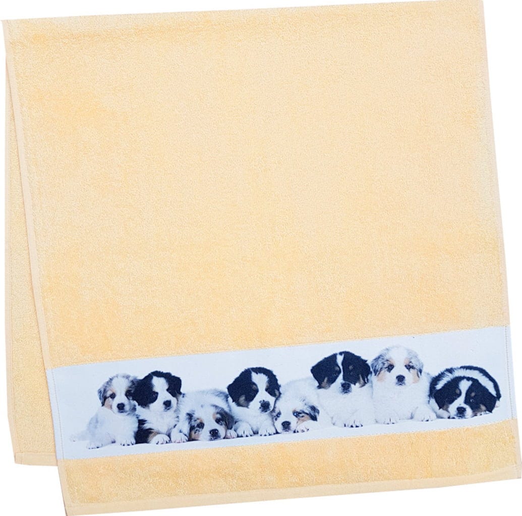 Questo asciugamano in spugna di cotone è particolarmente morbido e, grazie alla stampa che ritrae dei dolci cagnolini sul bordo, è ideale anche come regalo per tutti gli appassionati dei cani.