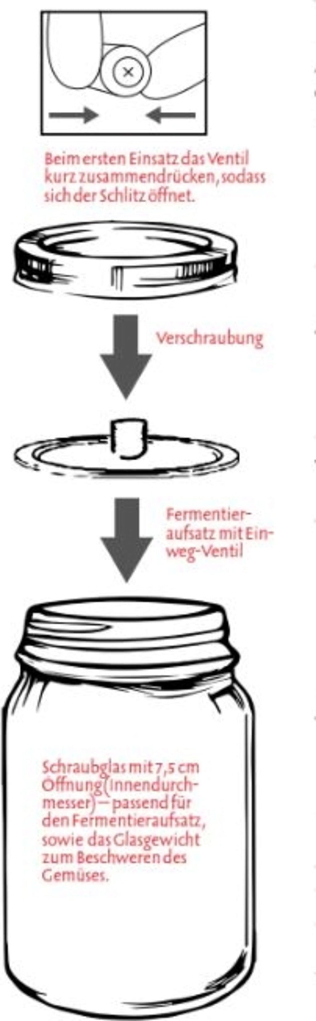 La valvola consente al gas formatosi durante il processo di fermentazione di fuoriuscire. L'unidirezionalità della valvola fa in modo che i cibi siano preservati da influenze esterne. Quando si utilizza per la prima volta questo coperchio è bene fare una leggera pressione sulla valvola in modo che la fessura si apra. Per produrre le verdure fermentate è sufficiente porre il peso in vetro sopra alle verdure ben pressate, posizionare il coperchio sottovuoto sul vasetto e avvitarlo saldamente con la ghiera filettata. Quindi si dovrà riporre il vasetto in un luogo fresco e al buio.