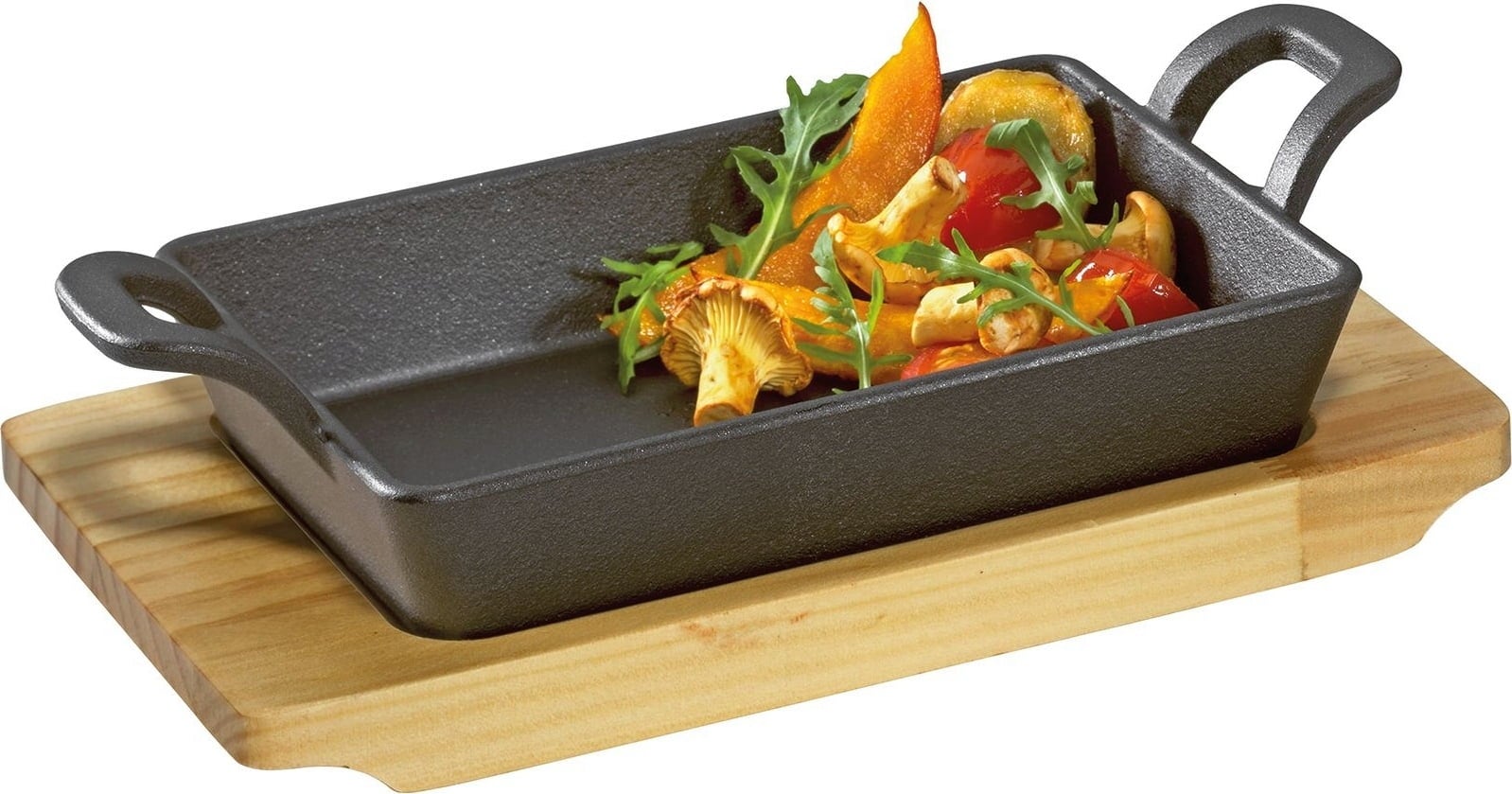 Perfetta per gustosi contorni alla griglia. Che si tratti di frutti di mare, verdure o formaggio di capra gratinato, la robusta padella di servizio in ghisa è una valida alternativa alle vaschette monouso in alluminio.
