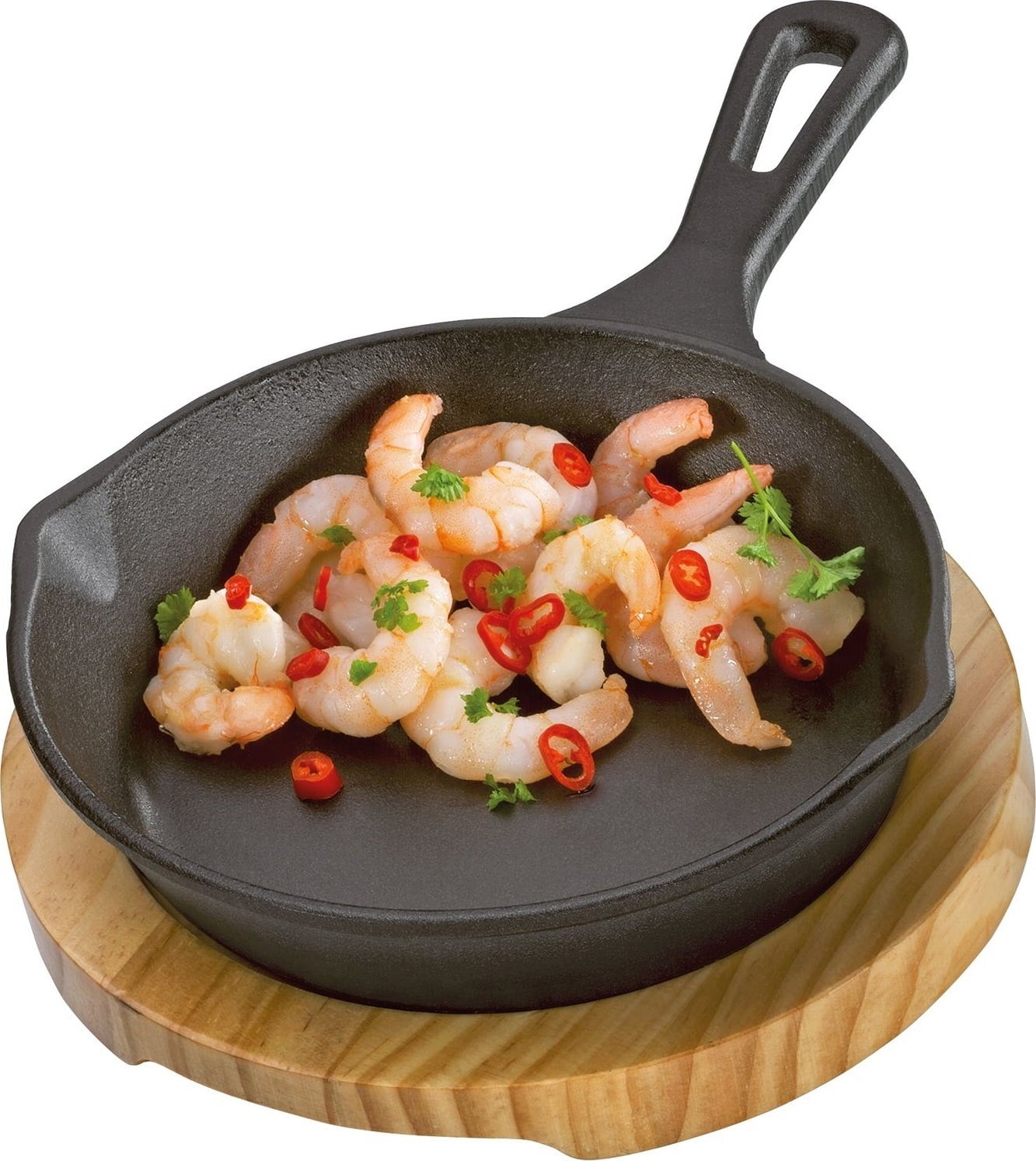 Perfetta per gustosi contorni alla griglia. Che si tratti di frutti di mare, verdure o formaggio di capra gratinato, la robusta padella di servizio in ghisa è una valida alternativa alle vaschette monouso in alluminio.