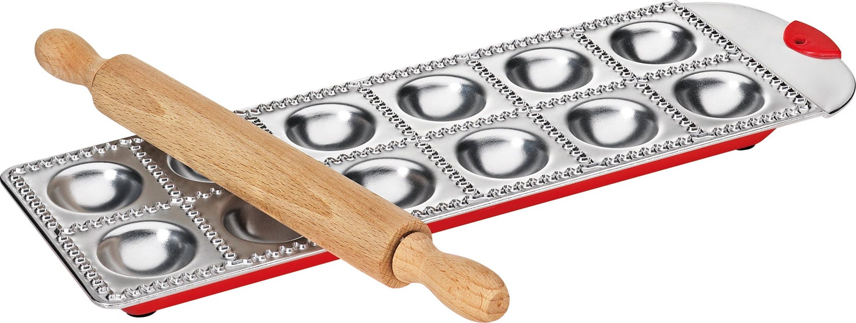 Utilizzo semplice: stendere l'impasto sottile, spolverare con farina e adagiarlo sulla tavola. Premere l'impasto nelle cavità e aggiungere il ripieno. Spennellare i bordi con tuorlo d'uovo sbattuto, coprire con una seconda sfoglia e passare delicatamente il mattarello. Estrarre i ravioli dallo stampo e procedere alla cottura.