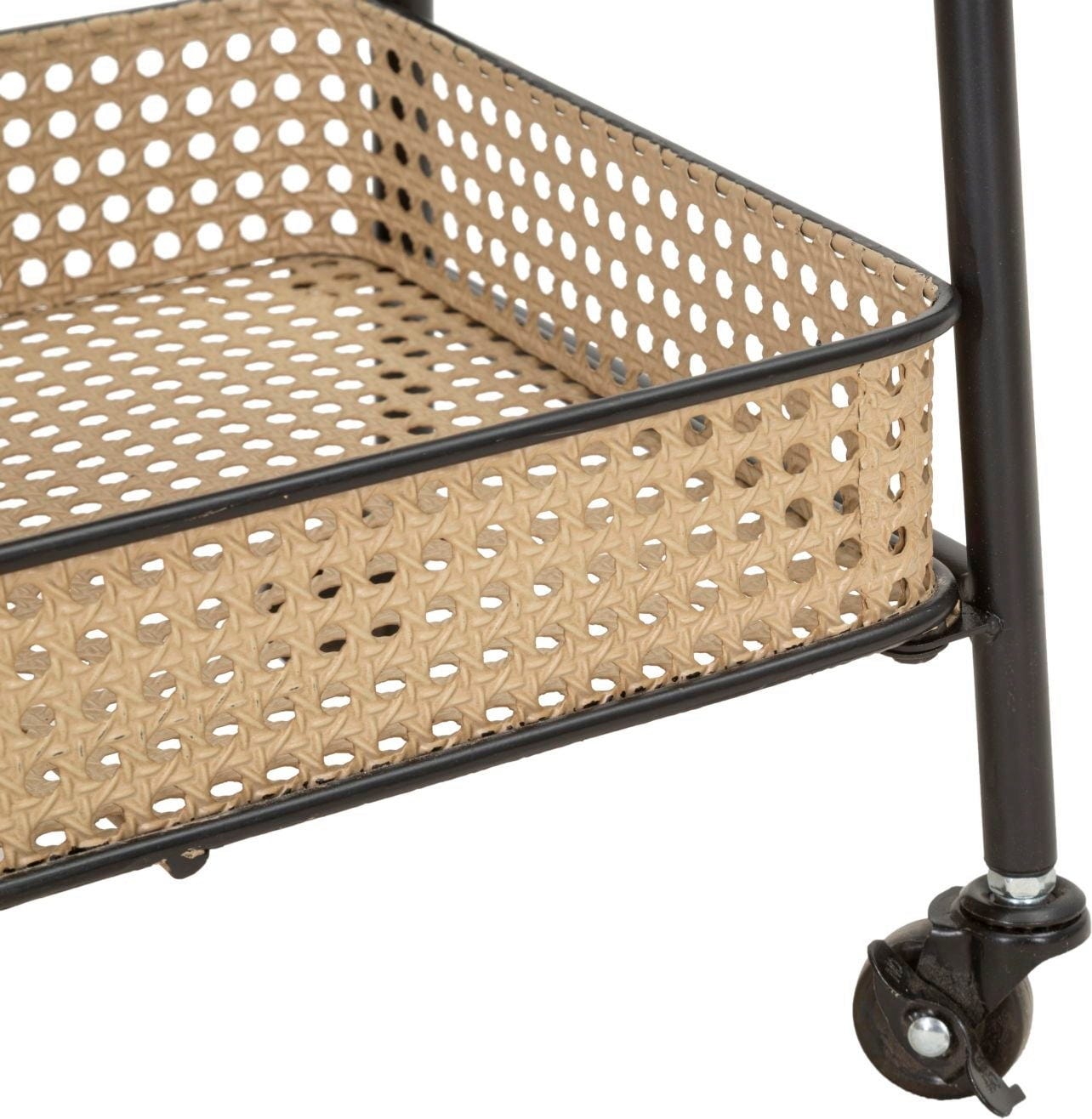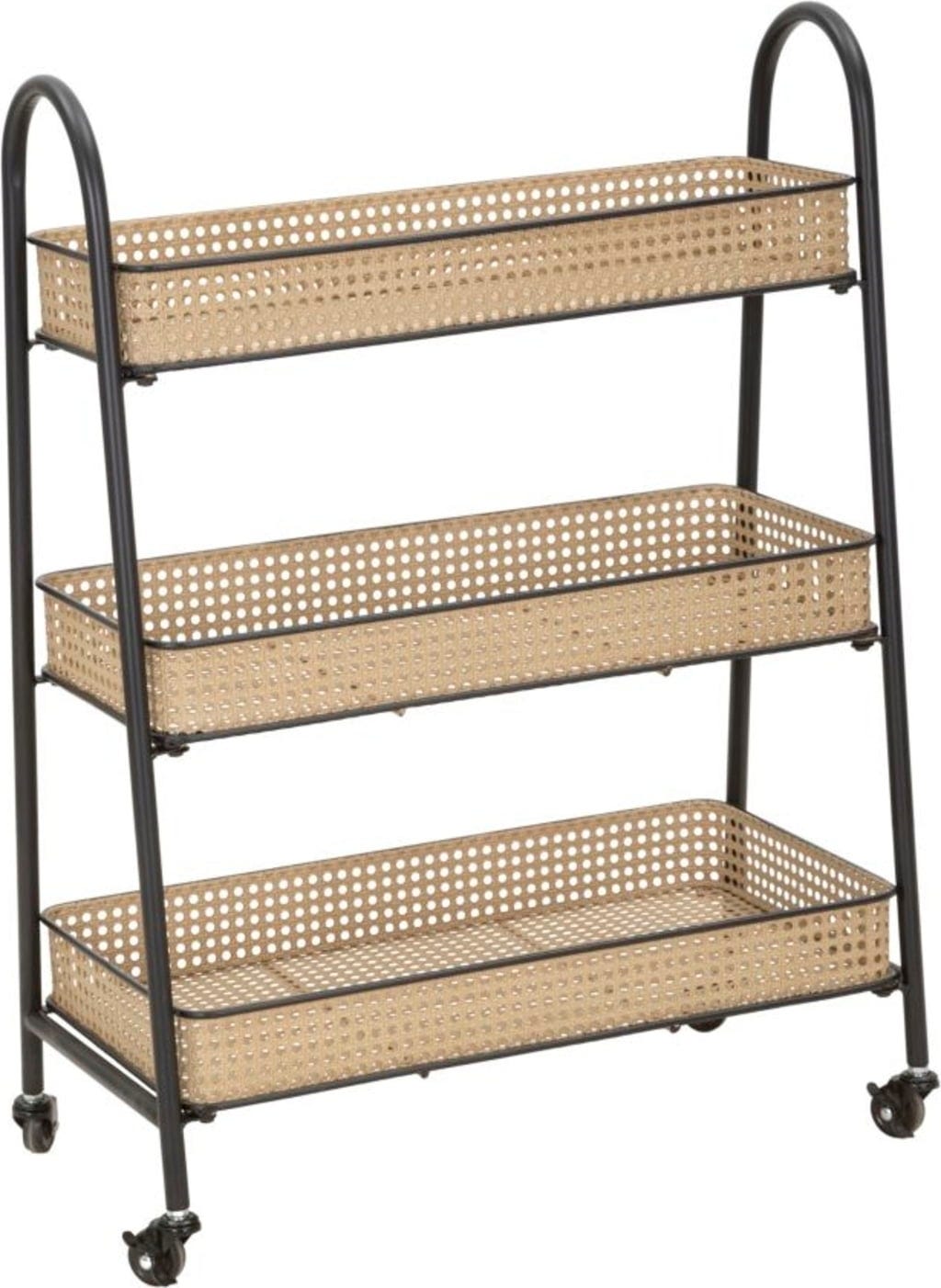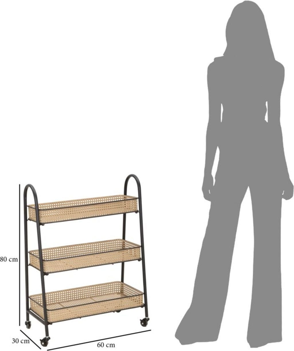 Il punto forte sono i tre ampi livelli in metallo lavorato, che riproducono con sorprendente realismo l'effetto della classica paglia di Vienna. Un dettaglio che dona al carrello moderno un tocco nostalgico e arioso. Grazie alle quattro ruote scorrevoli e alle maniglie arrotondate, Fuji si sposta con facilità dove serve. Perfetto come bar mobile, portapiante elegante o pratico alleato in cucina.