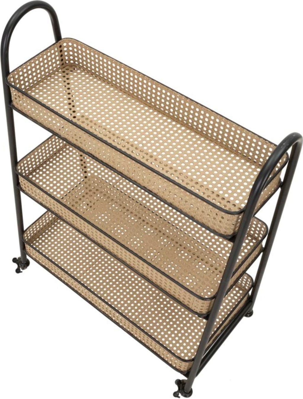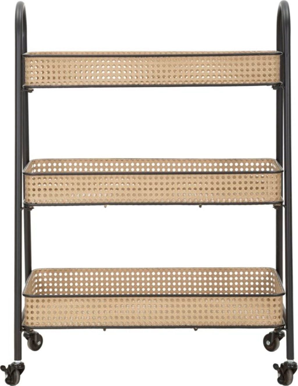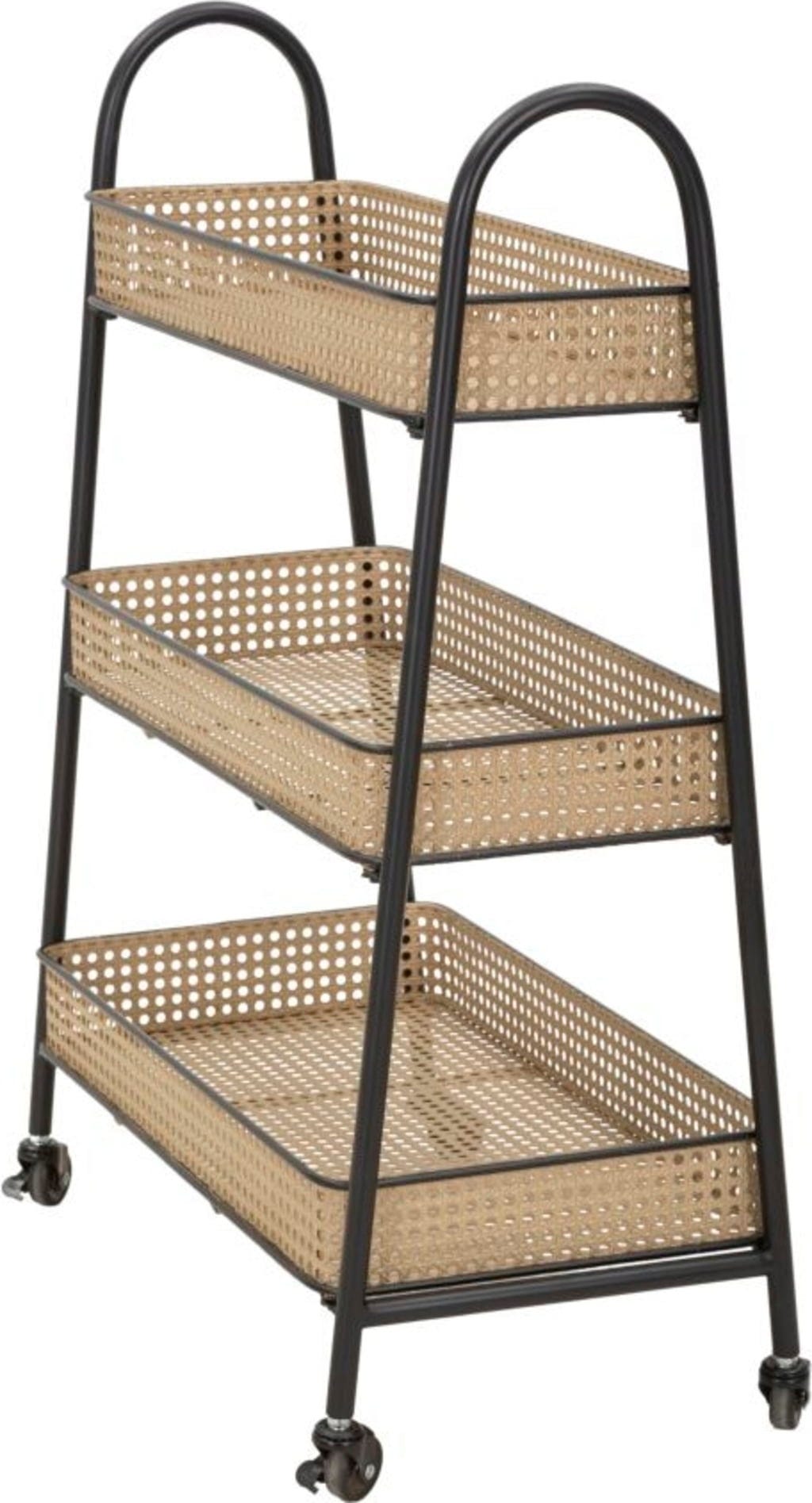 Il punto forte sono i tre ampi livelli in metallo lavorato, che riproducono con sorprendente realismo l'effetto della classica paglia di Vienna. Un dettaglio che dona al carrello moderno un tocco nostalgico e arioso. Grazie alle quattro ruote scorrevoli e alle maniglie arrotondate, Fuji si sposta con facilità dove serve. Perfetto come bar mobile, portapiante elegante o pratico alleato in cucina.