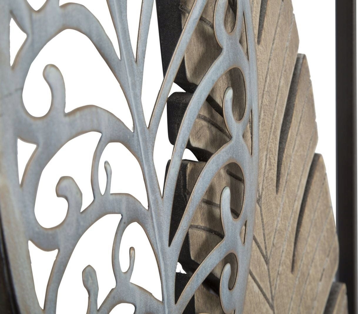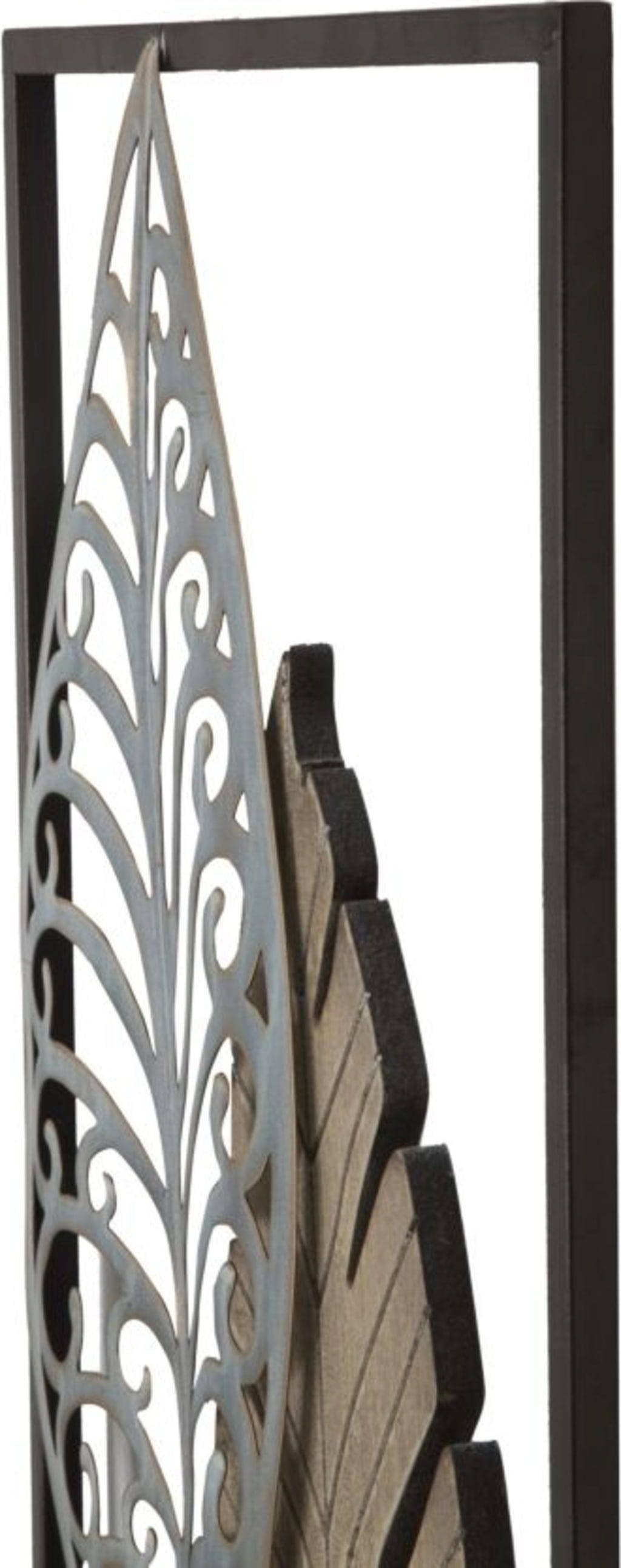 I dettagli traforati donano leggerezza e creano giochi di luce suggestivi, mentre la cornice scura incornicia il design con sobria eleganza. Ideale in soggiorno o in ingresso, porta con sé un tocco di nostalgia e stile intramontabile.
