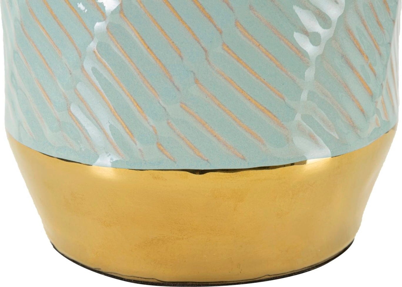 Dona al tuo ambiente un’atmosfera fresca ma lussuosa con questa elegante lampada da tavolo. Il corpo in ceramica di alta qualità in una delicata tonalità azzurro chiaro porta in casa una sensazione di leggerezza e tranquillità. Il design essenziale è impreziosito da brillanti dettagli dorati alla base e sul collo della lampada, per un tocco glamour.