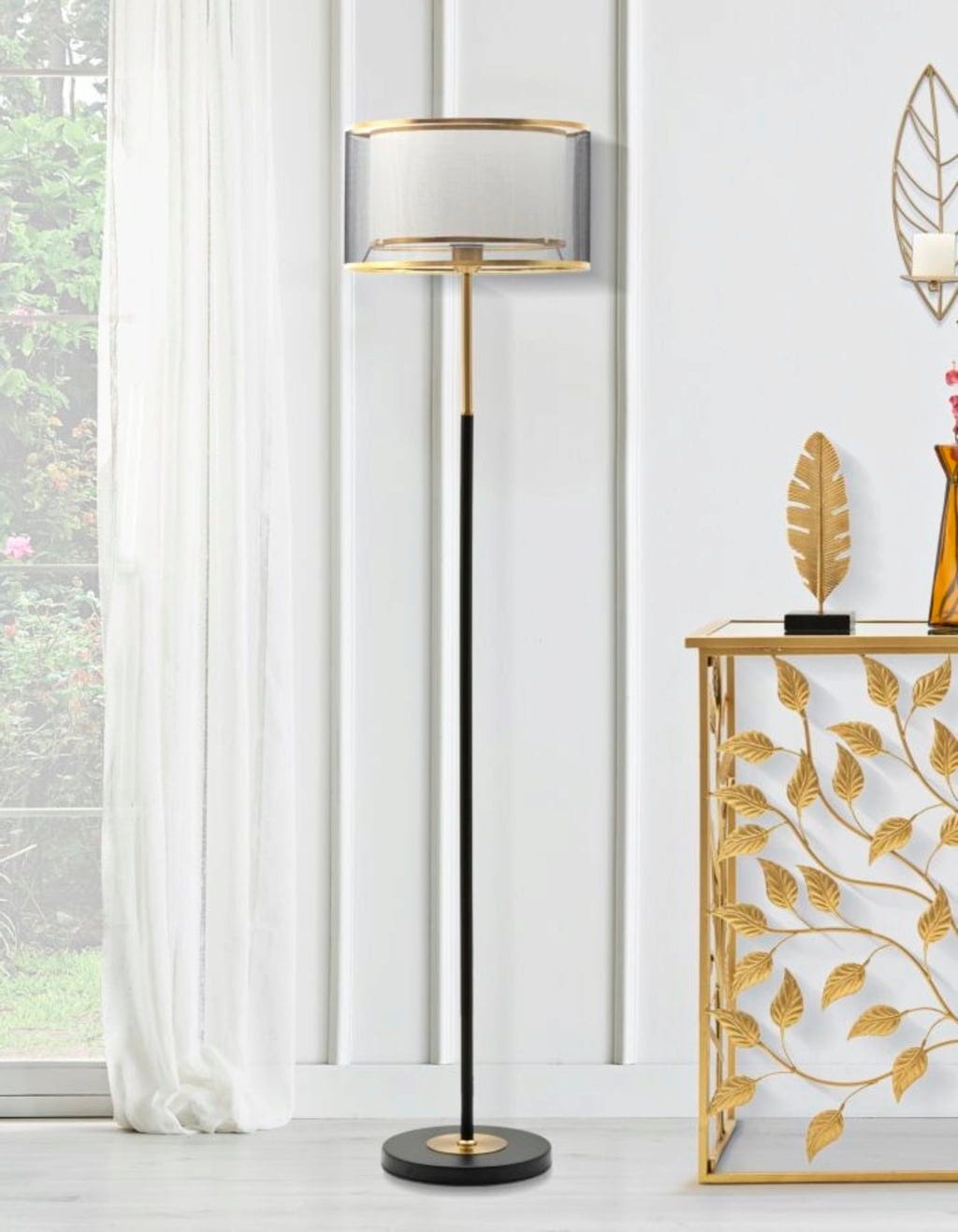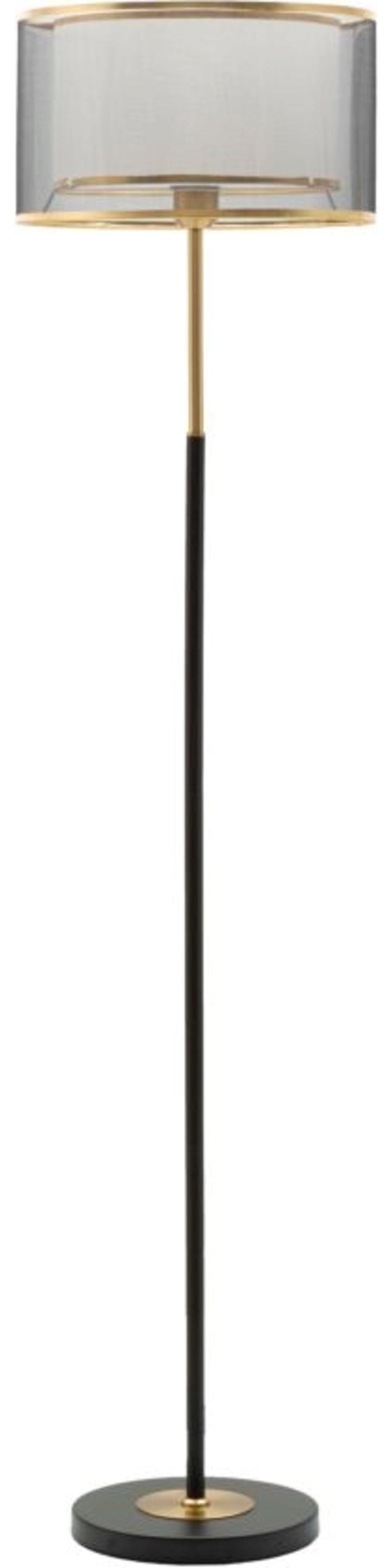 Il protagonista è il paralume a due livelli: uno interno bianco, avvolto da uno esterno in tessuto trasparente grigio. Entrambi sono rifiniti con un elegante bordo dorato che richiama la struttura bicolore e aggiunge un tocco prezioso. Grazie a questa costruzione innovativa, la luce viene filtrata delicatamente creando un'illuminazione calda e avvolgente, ideale per soggiorno o camera da letto.