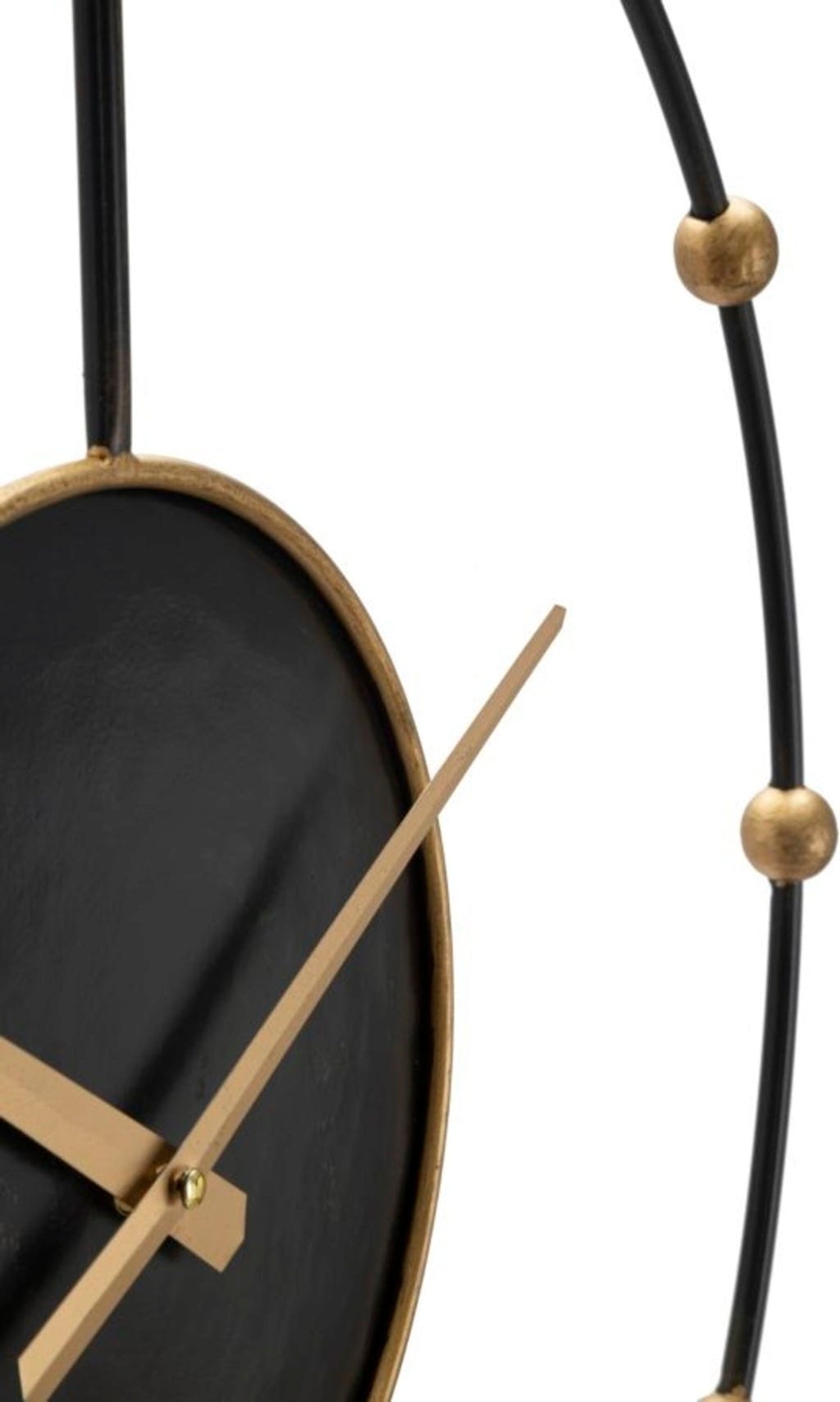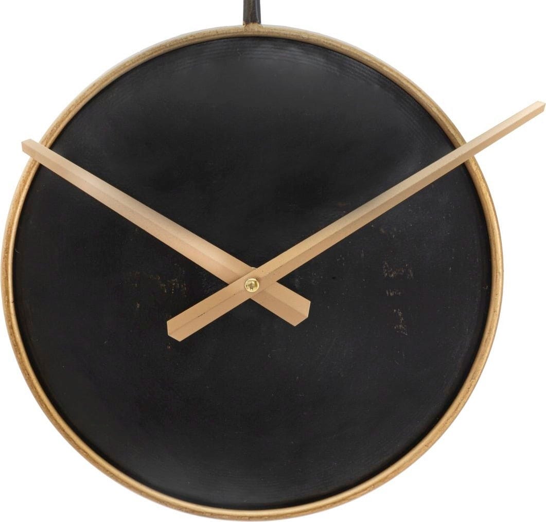 Al centro sembra sospeso il quadrante nero profondo con bordo dorato, su cui scorrono lancette dorate lineari. Il contrasto intramontabile tra nero e oro lo rende perfetto per qualsiasi stile, dall'industrial al loft moderno fino agli interni più classici.
