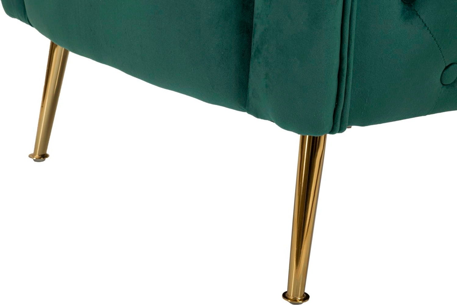 L’eleganza della poltrona è valorizzata dalle sottili gambe in metallo dorato, che creano un raffinato contrasto glamour con la tonalità intensa del rivestimento. Un cuscino coordinato per lo schienale è incluso. Perfetta come punto focale in soggiorno o per rendere ancora più accogliente l’angolo lettura.
