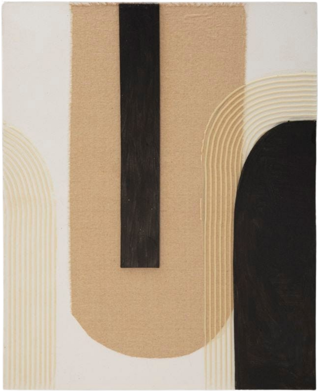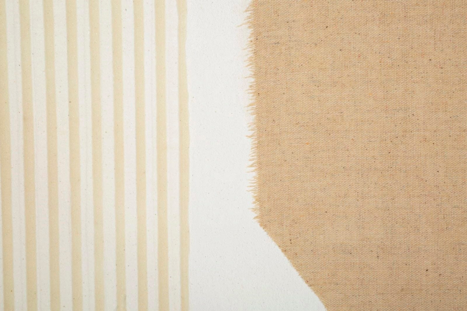 L'opera combina ampie geometrie nere con calde tonalità beige su una tela chiara. Il vero punto di forza, sia visivo sia tattile, sono le applicazioni a rilievo che scorrono in archi precisi, insieme ai bordi volutamente sfrangiati degli elementi in tessuto. Teso su un solido telaio in legno, questo quadro unisce rigore architettonico e texture naturale in un equilibrio unico.