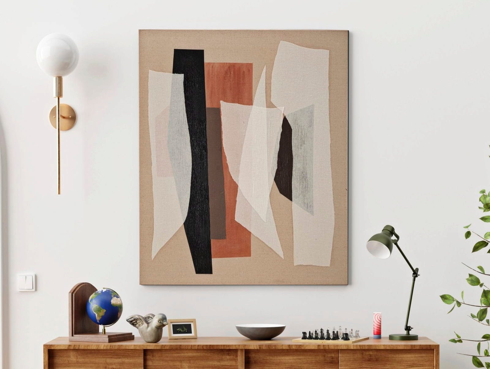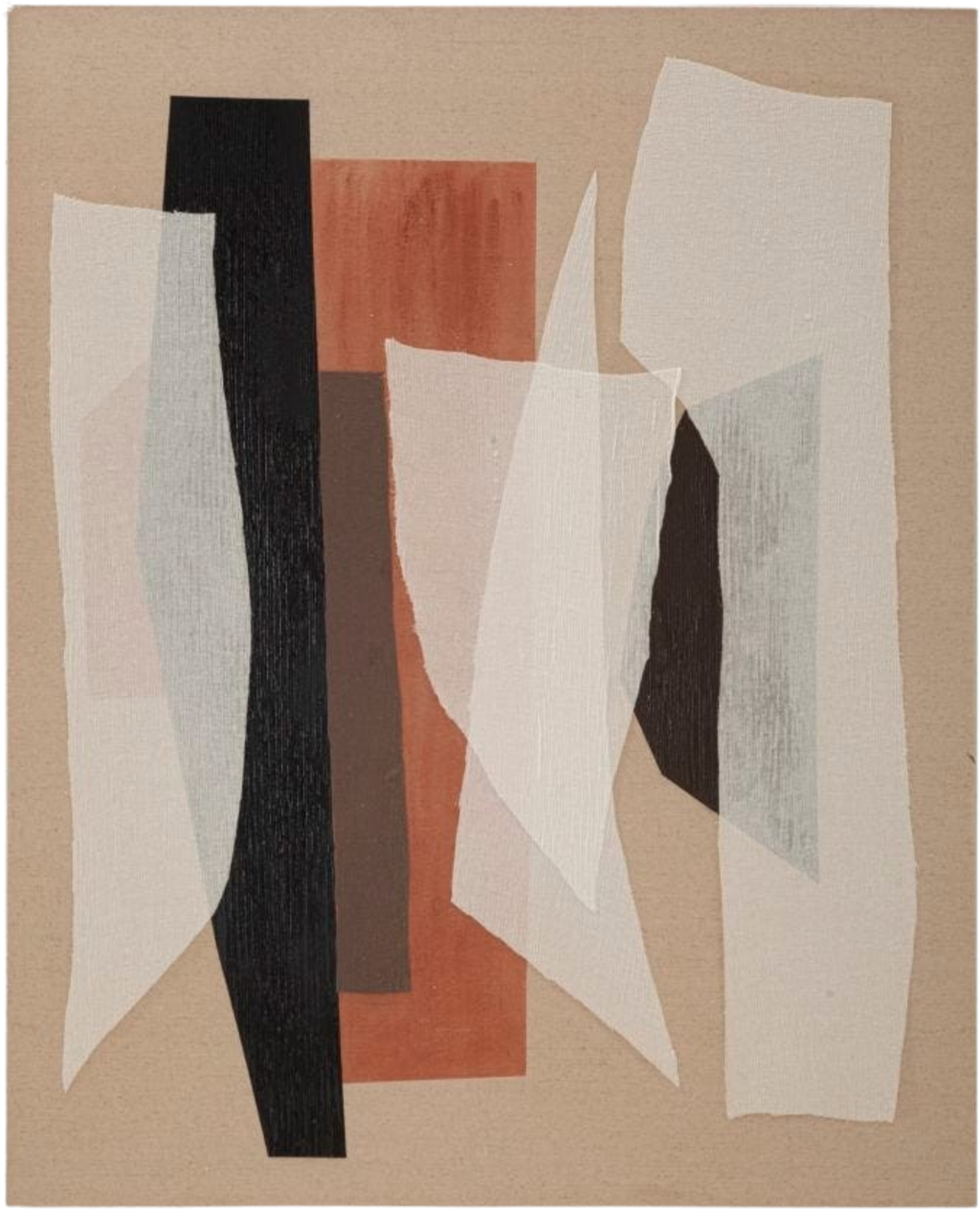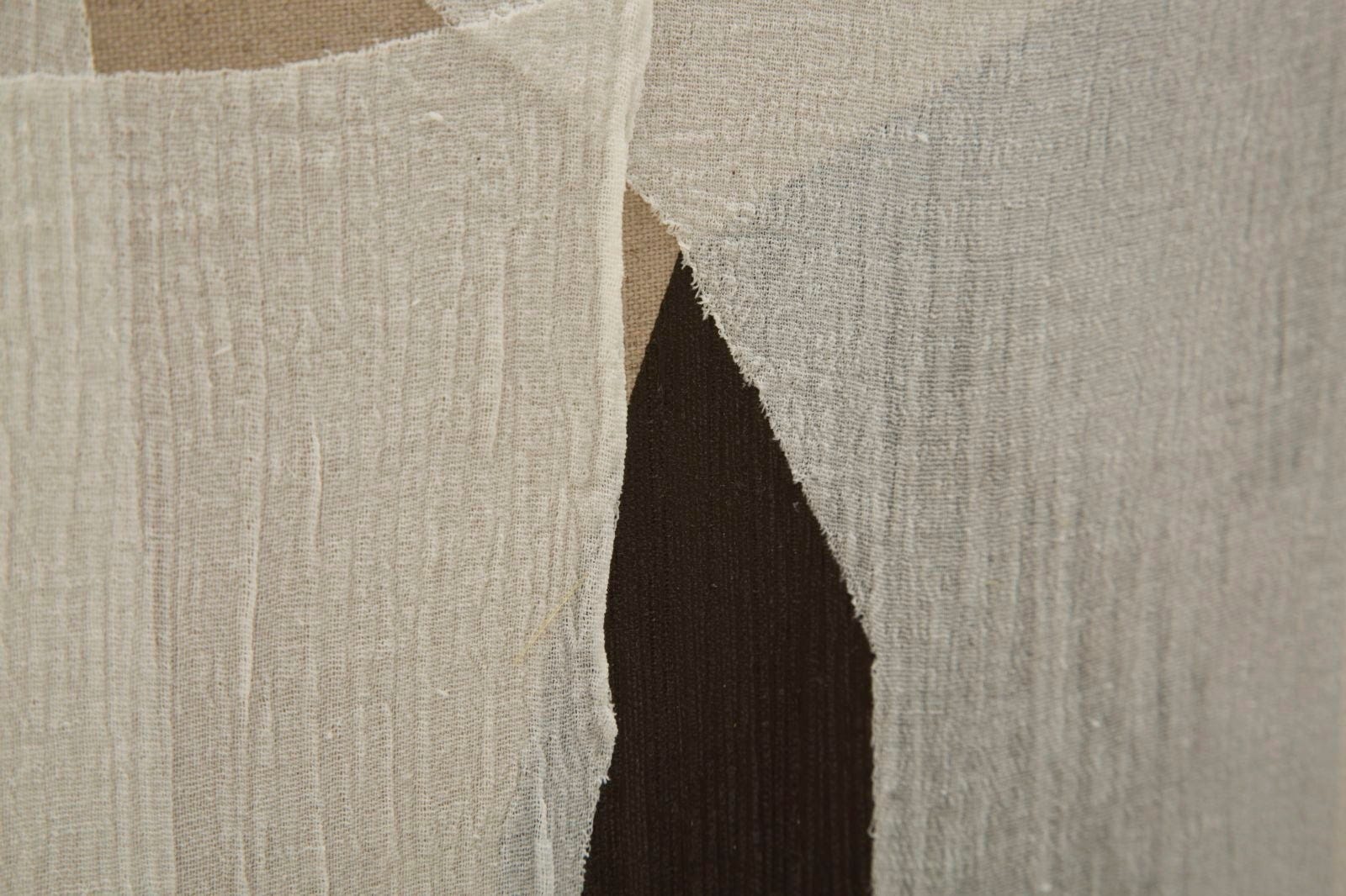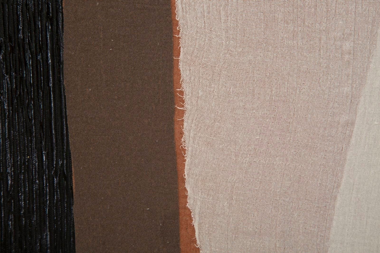 L'opera conquista con le sue applicazioni stratificate: elementi in tessuto traslucido in bianco e grigio chiaro si adagiano come veli su intense fasce verticali in nero, terracotta e marrone scuro. Le diverse trasparenze creano un rilievo dinamico e una resa materica viva e tattile. In ufficio o in soggiorno, Redy -B- è un punto focale dal taglio architettonico, dove naturalezza e modernità si incontrano con armonia.