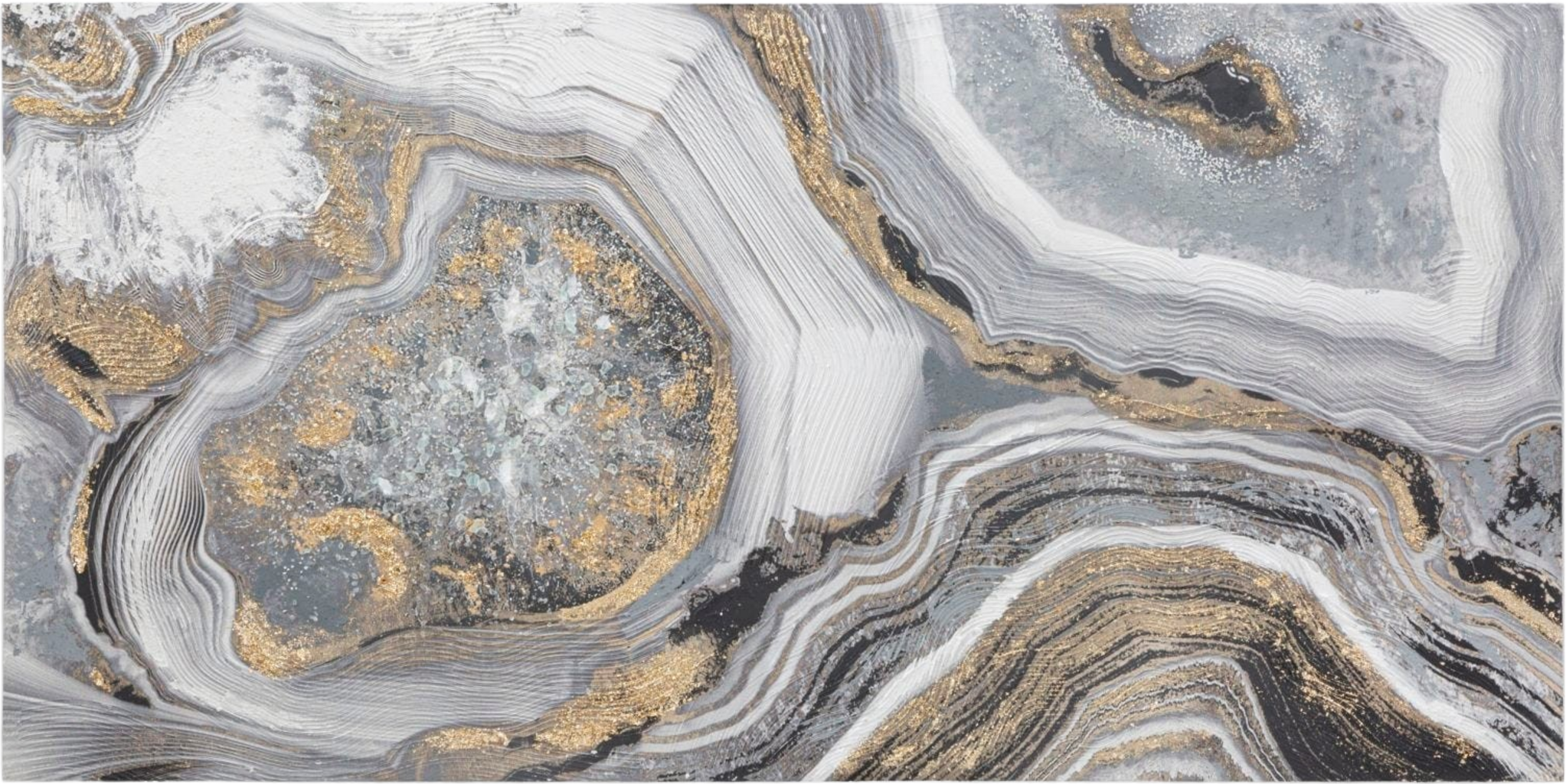 Il design richiama una suggestiva struttura geologica, come l'interno di una drusa preziosa o di una grotta segreta. Strati intrecciati di grigio raffinato, antracite e bianco crema creano un rilievo complesso, animato da splendide venature dorate e inserti scintillanti. Teso su un solido telaio in legno, questo quadro è un vero punto focale che fonde con stile natura e arte contemporanea.