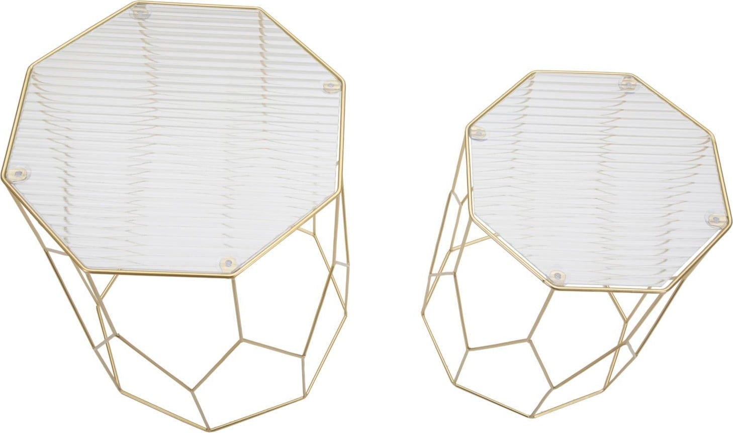 Dona al tuo living una dinamica visiva davvero affascinante con il set New Glass in 2 pezzi di Mauro Ferretti. I due tavolini ottagonali si distinguono per la struttura slanciata in metallo color oro, dove le linee geometriche creano un raffinato motivo a rombi.