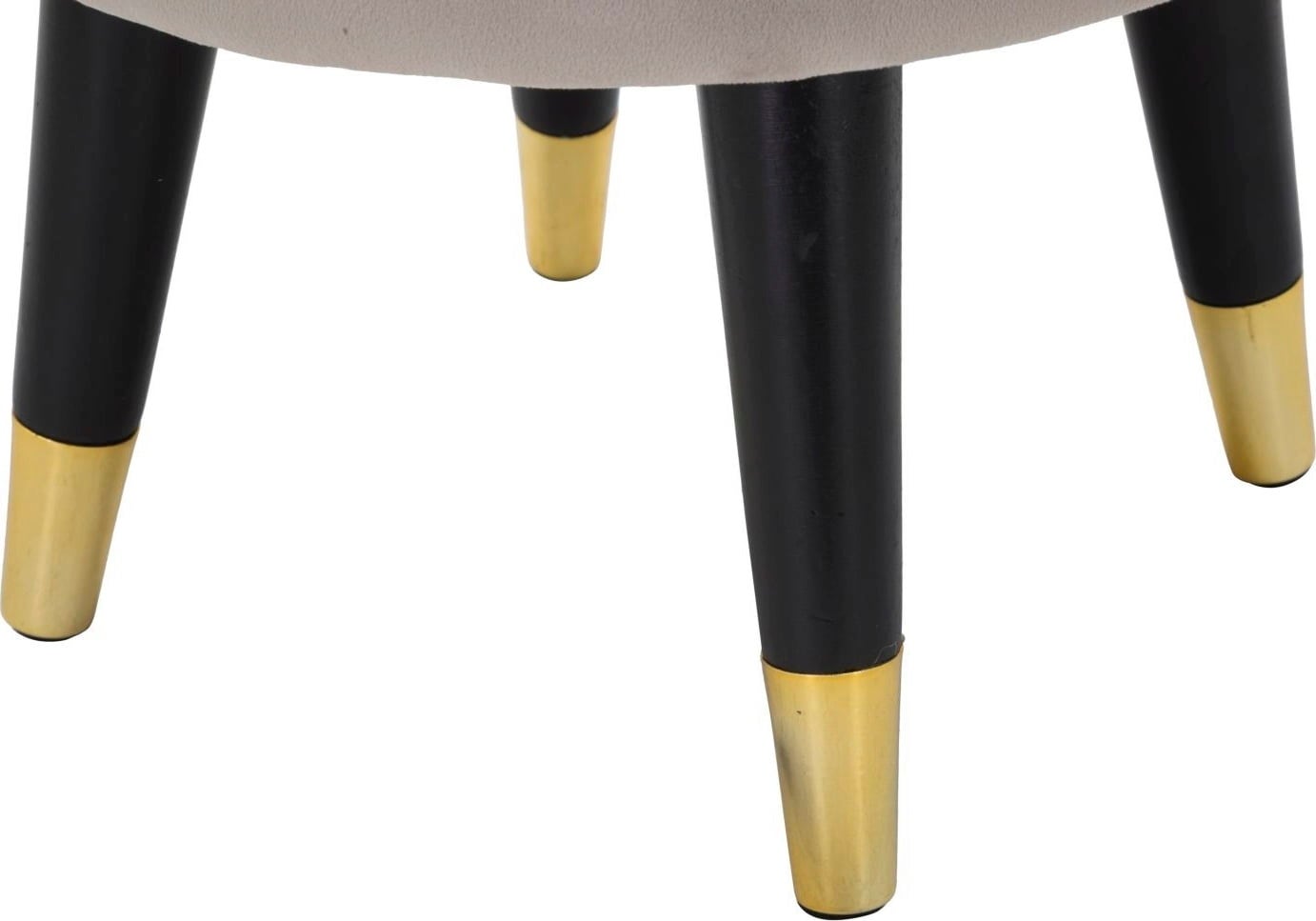 Un vistoso anello in metallo dorato incornicia la seduta e aggiunge un accento brillante. Lo sgabello è sostenuto da gambe inclinate in legno nero, rifinite con terminali in metallo dorato. Ideale come seduta d’appoggio in soggiorno o come elegante complemento in camera da letto.