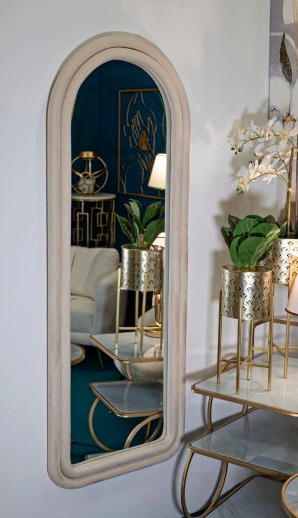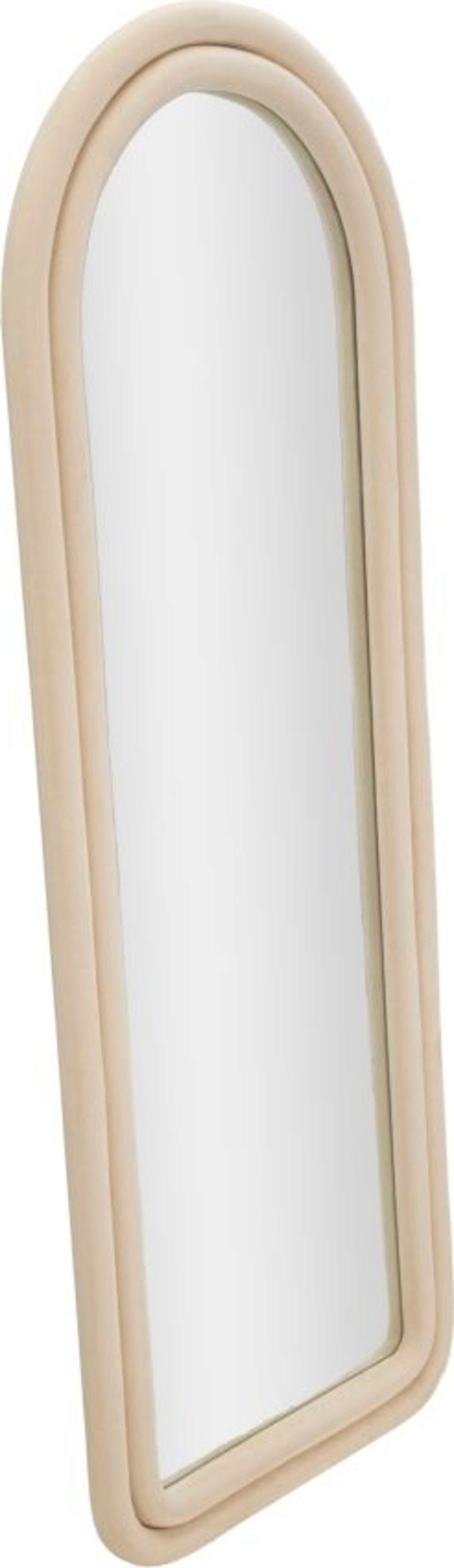 Grazie al colore delicato, lo specchio si inserisce facilmente in camera da letto, nella zona guardaroba o in ingresso. L'incontro tra la superficie riflettente e la cornice leggermente imbottita crea una sensazione di accoglienza e stile, trasformando ogni sguardo allo specchio in un piccolo momento speciale.