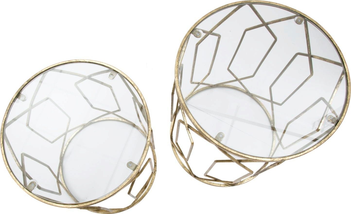 Vivi l’effetto scenografico della combinazione tra oro e vetro con questi tavolini laterali dal fascino lussuoso e glamour, proposti in un pratico set da 2. Il set è ideale per valorizzare con stile i tuoi oggetti preferiti. La struttura in metallo color oro colpisce per il suo design geometrico, che crea un elegante effetto di leggerezza e slancio.