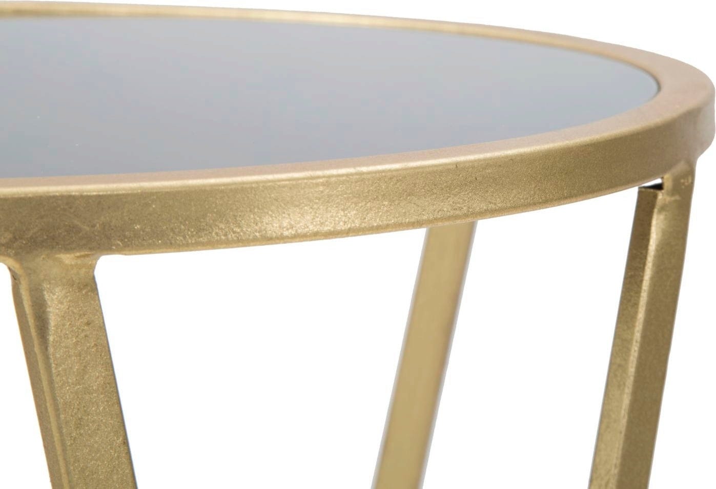 Con questo elegante tavolino laterale porti nella tua casa la magica atmosfera degli anni Venti. La combinazione tra la struttura in metallo dorato e il piano in vetro temperato nero crea un forte impatto visivo.