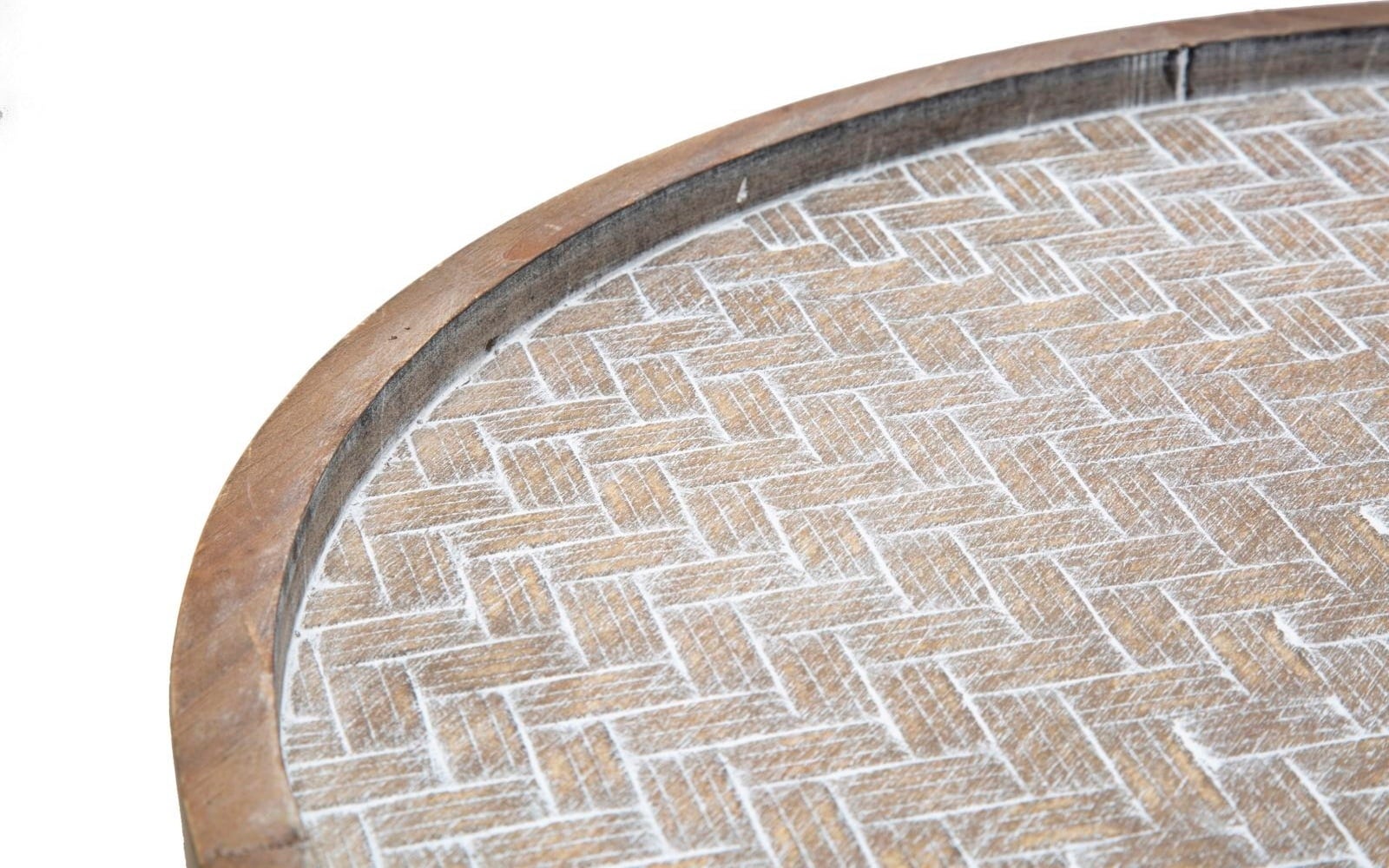 Il tavolino dispone di due ripiani rotondi: i piani sono realizzati in legno con una moderna finitura effetto intreccio, che aggiunge un caldo accento naturale. Il ripiano inferiore è perfetto per riporre riviste o telecomandi.