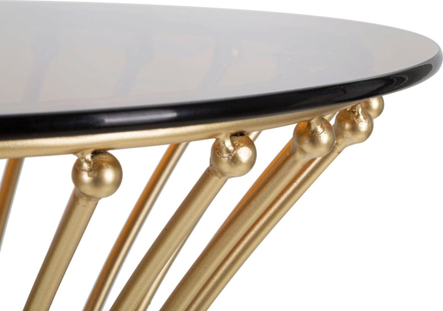 La struttura è composta da numerose aste verticali che si restringono elegantemente al centro e terminano con piccole sfere decorative lucide. Il piano in vetro fumé di alta qualità dona profondità e un'eleganza contemporanea, valorizzando il caldo finish dorato. Perfetto come elemento d'accento ricercato.