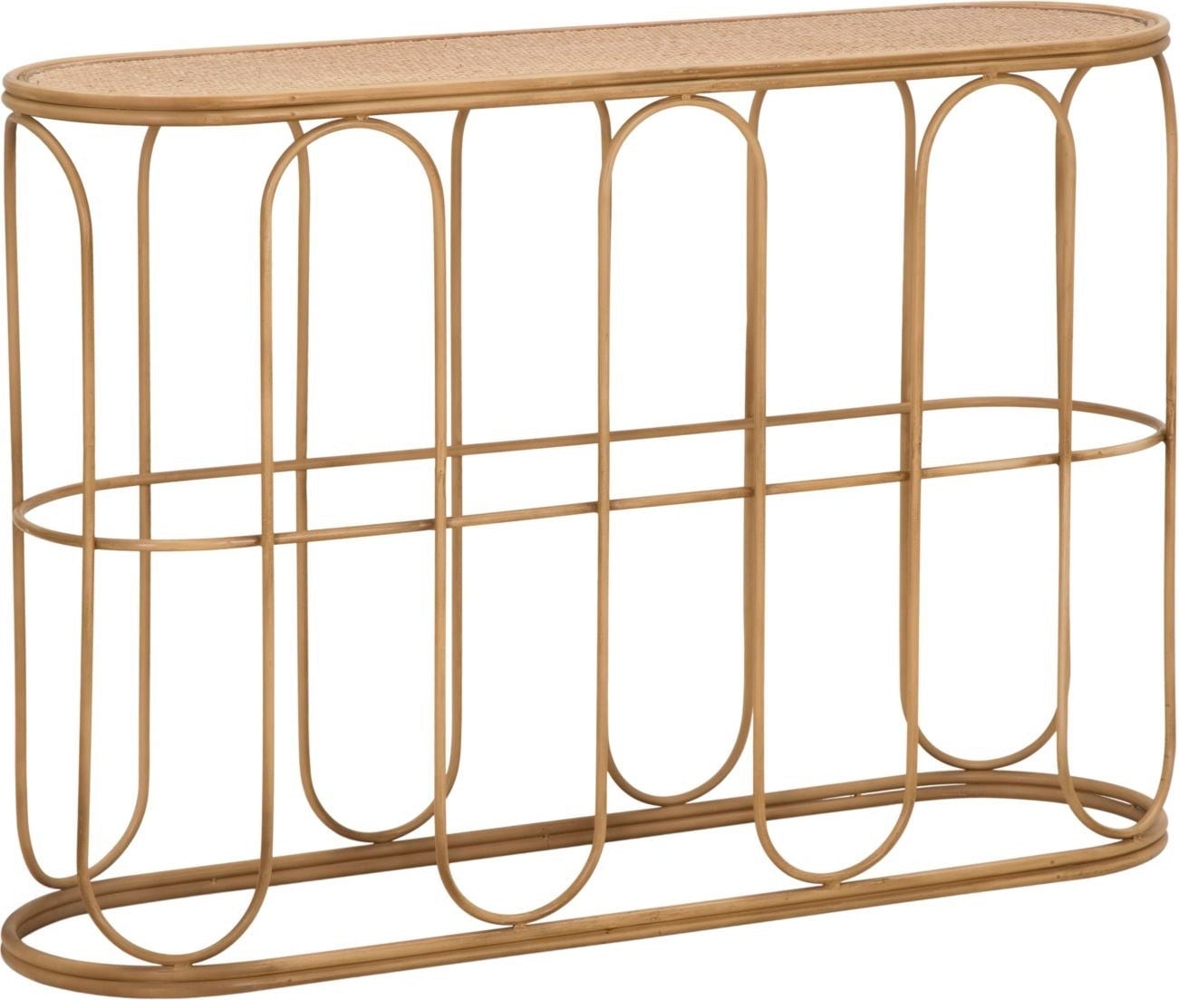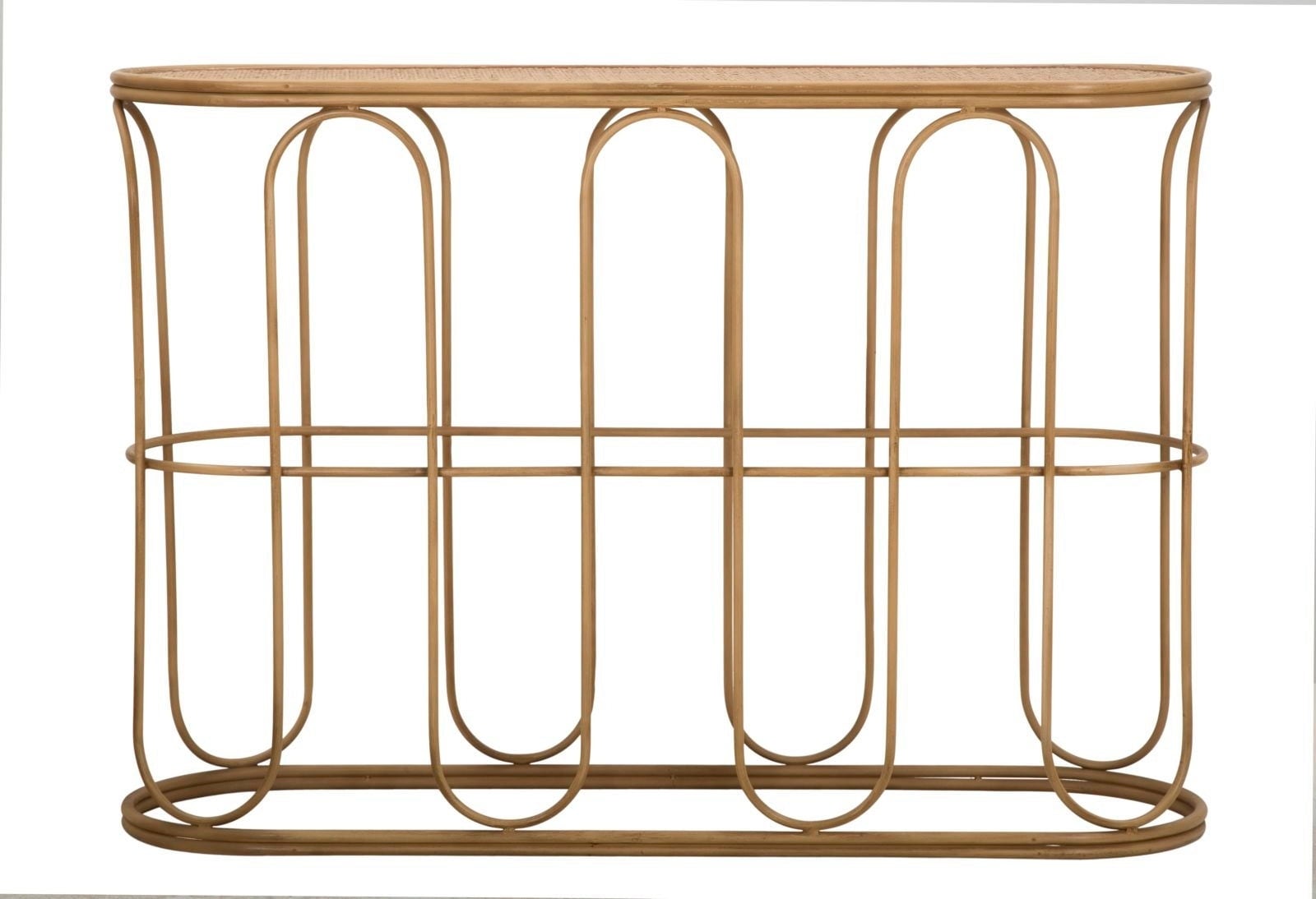 Dona al tuo ingresso o al soggiorno un’atmosfera calda e accogliente con questa elegante consolle. Il design, ispirato ai materiali naturali, si distingue per linee morbide e sinuose e lati arrotondati. La struttura alta è realizzata in metallo e riproduce con cura l’aspetto delle canne di bambù. Il ripiano ovale è rivestito con un raffinato intreccio in rattan.