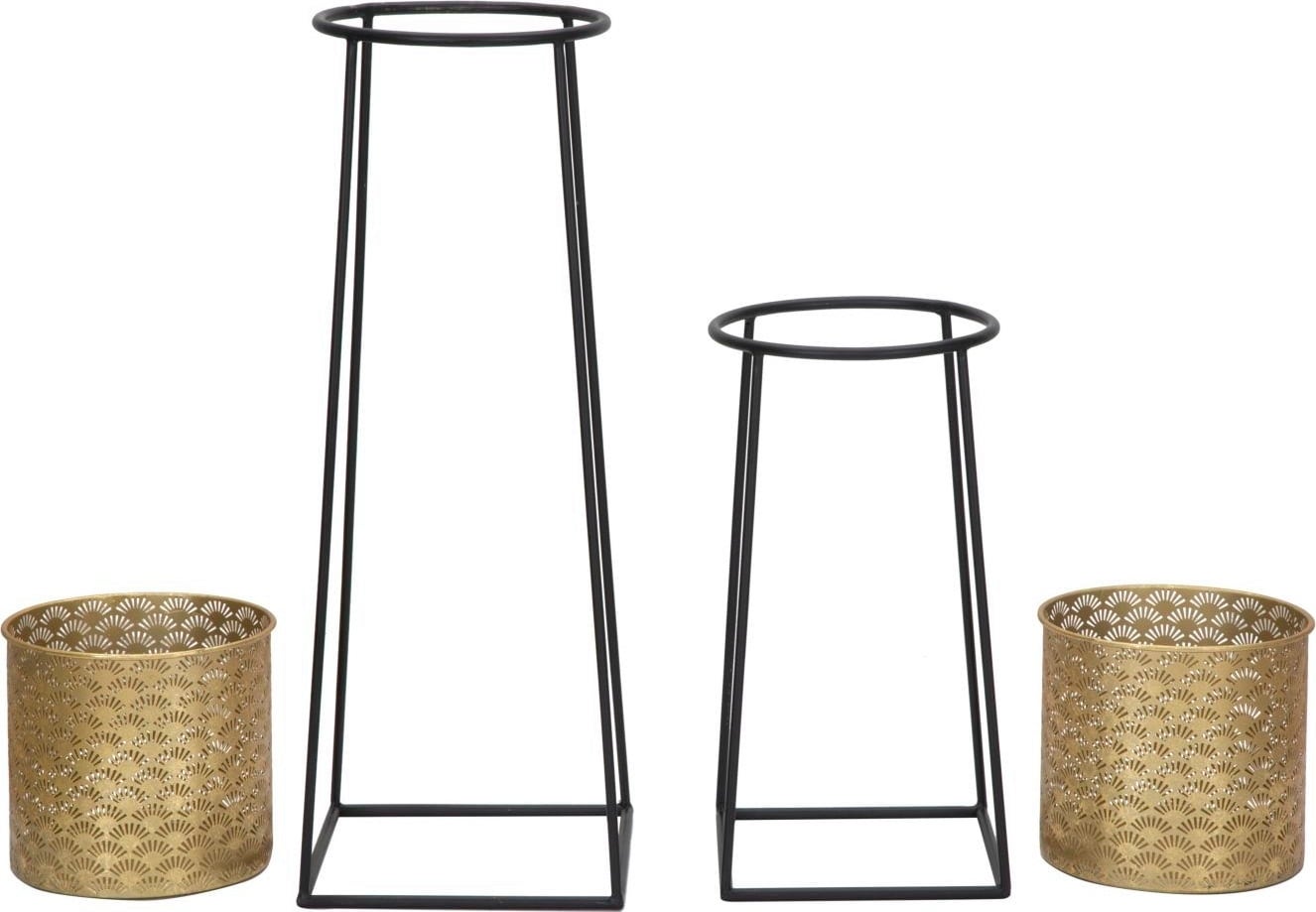 Dona ai tuoi ambienti un tocco di eleganza e leggerezza con questi raffinati vasi da fiori con supporto nero, proposti in un pratico set da 2. Il design si distingue per il contrasto moderno: i vasi rotondi sono realizzati in metallo color oro e decorati con un delicato motivo geometrico a ventaglio, che si valorizza particolarmente alla luce.