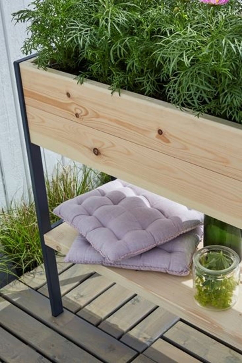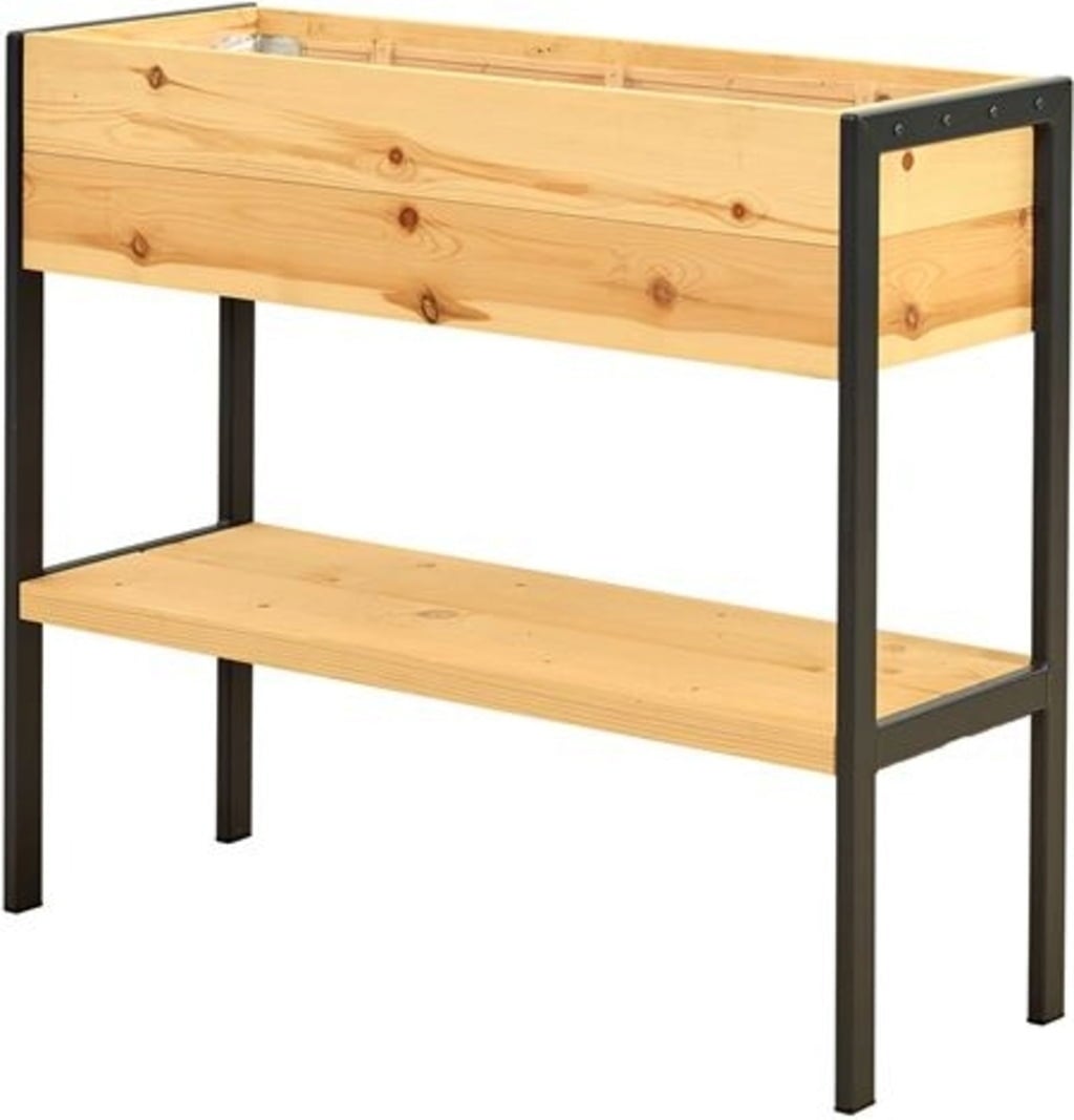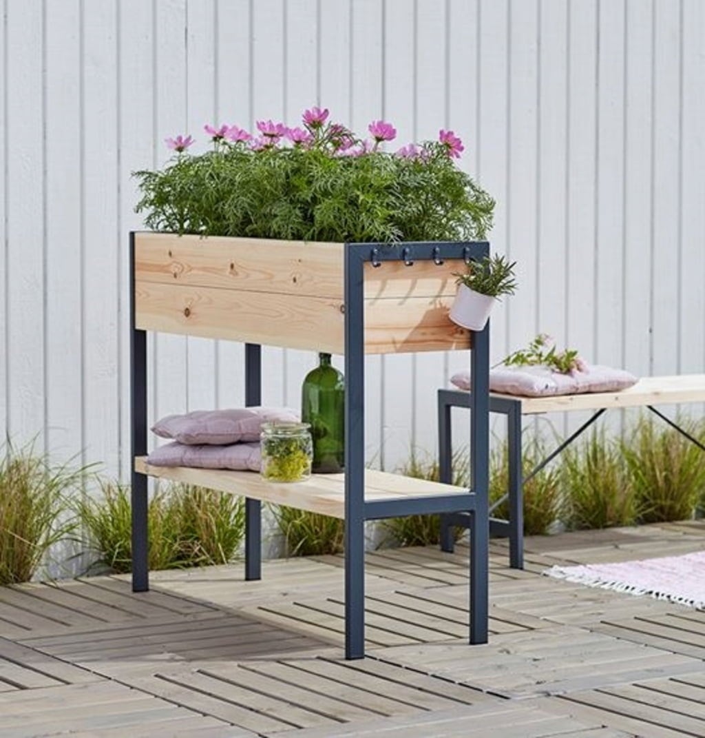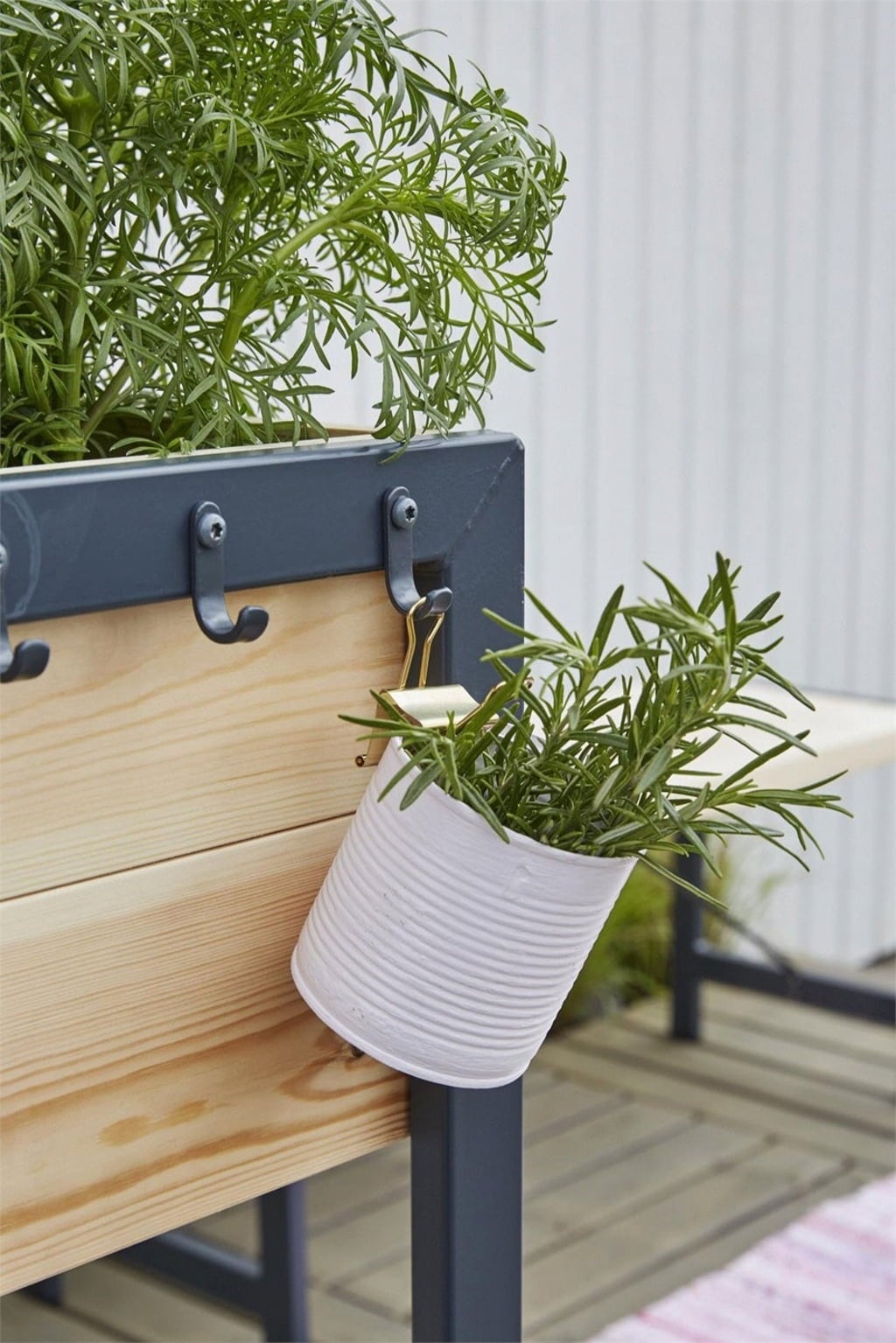 Questa elegante fioriera colpisce per la sua eccellente combinazione di materiali e la solida lavorazione. Il legno tenero non trattato e l'acciaio verniciato a polvere garantiscono un aspetto accattivante e permettono ai fiori di essere valorizzati al meglio. Il ripiano è estremamente pratico per riporre vari attrezzi da giardinaggio e i ganci laterali sono perfetti per appendere attrezzi o piccole fioriere.