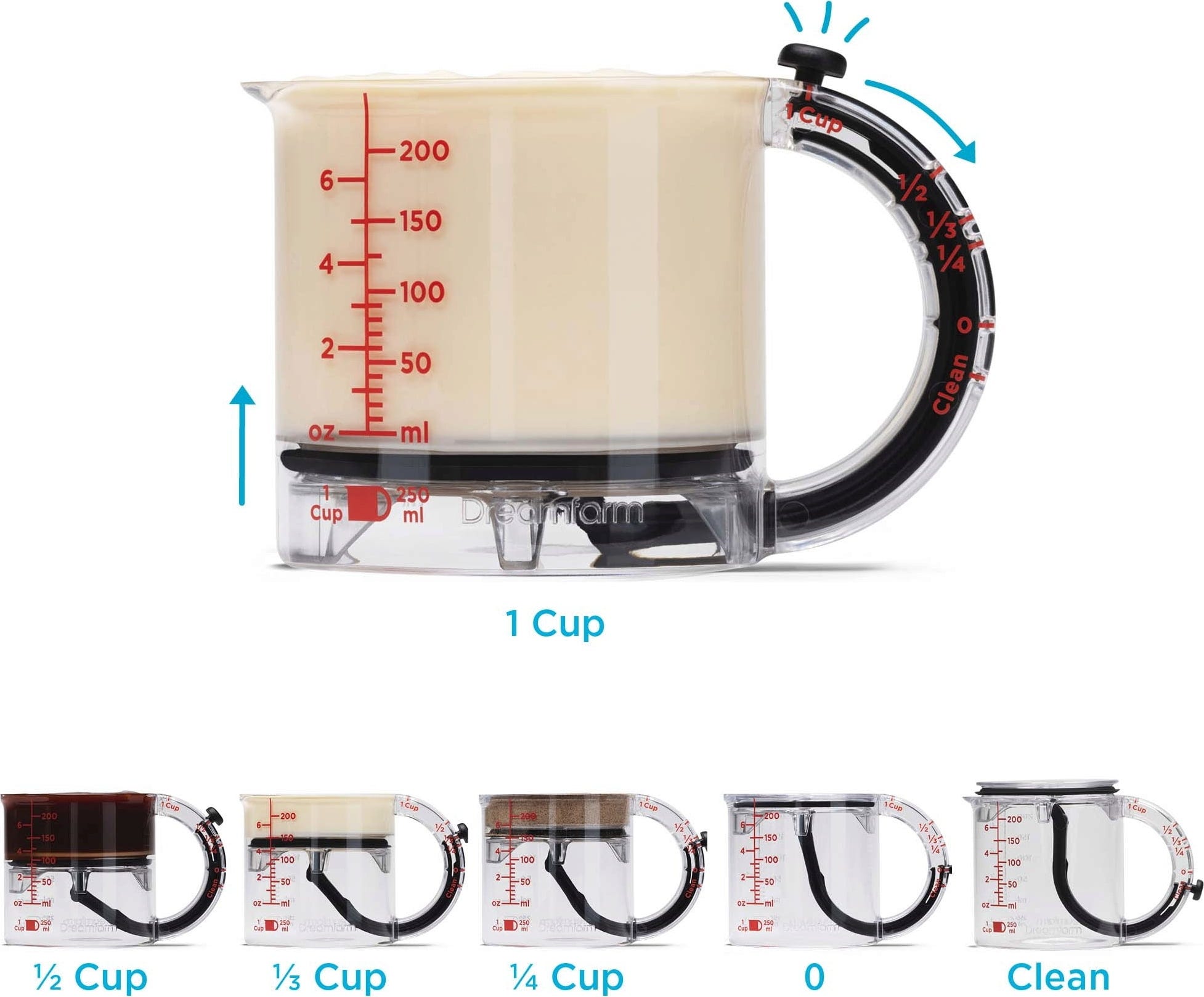 Che tu debba misurare la farina per una torta, dosare con precisione il latte o aggiungere uno sciroppo denso, il misurino Upcup di Dreamfarm è il compagno ideale per ogni ricetta. Questo intelligente utensile 4-in-1 si adatta perfettamente alle tue esigenze grazie al fondo scorrevole regolabile in modo continuo, permettendo di misurare con precisione in millilitri oppure in pratiche unità cup.