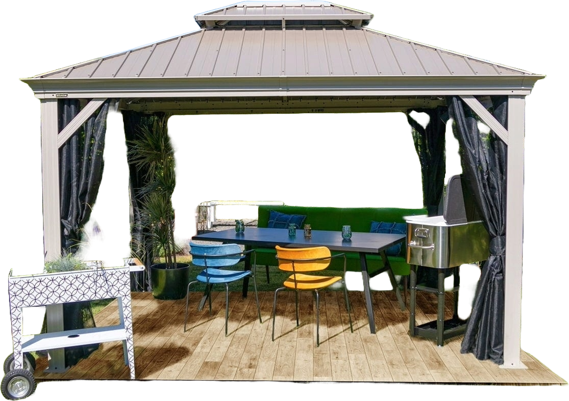 Il tetto doppio in acciaio favorisce la ventilazione grazie allo sfiato integrato, assicurando sempre aria fresca sotto il gazebo. Le zanzariere in nylon sono già incluse per momenti di relax senza insetti. Grazie alle guide a doppio binario puoi utilizzarle insieme a tende opzionali. Un dettaglio intelligente: le grondaie sono integrate discretamente nei montanti.