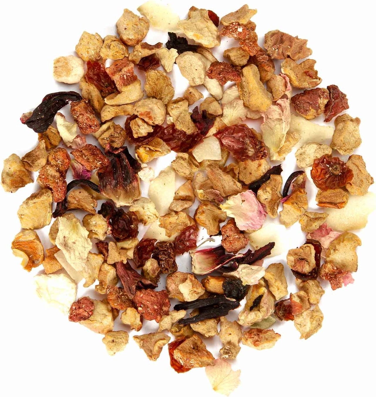 fette di mela[1], scorza di cinorrodo di rosa canina[1], fiori di ibisco[1], aroma naturale, cocco grattugiato[1], scaglie di cocco (tostate)[1], scorza d'arancia[1], fragole[1], petali di rosa[1]
